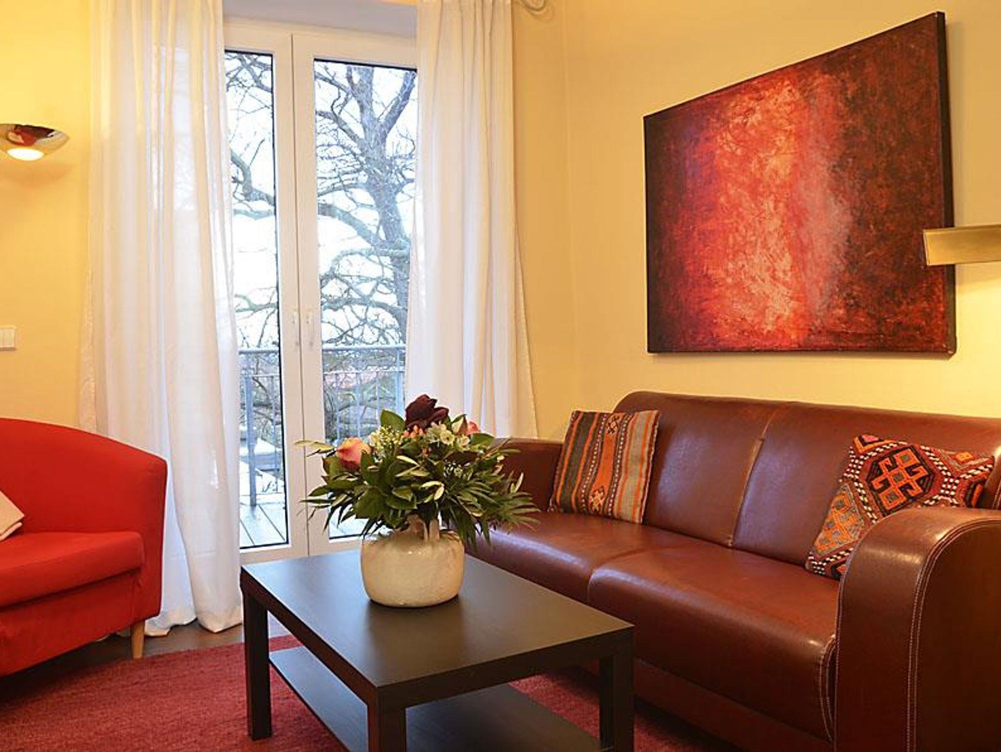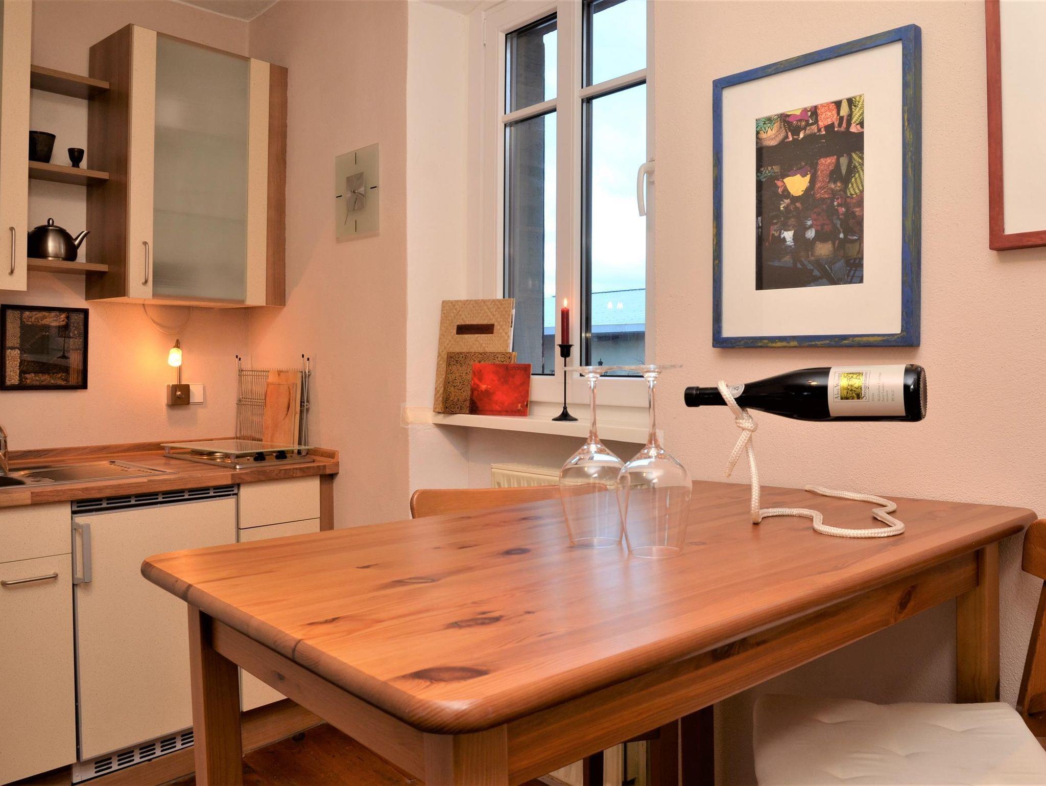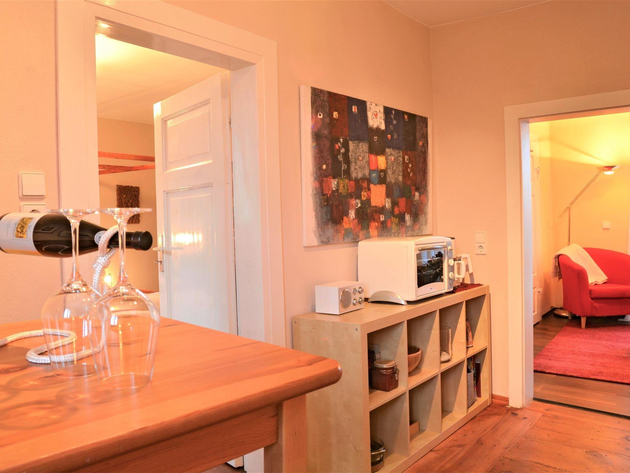 Die Ferienwohnung Kastanienbusch im Obergeschoss ist über eine steile, alte aber gut erhaltene Holztreppe erreichbar. Der ausgewählte dunkle Parkettboden und die leicht abstrakten Gemälde sorgen für eine dezente moderen Atmosphäre, die den Charme des alten Gebäudes akzentuiert ergänzt. An warmen Sommertagen bietet der Balkon ausreichend Platz für gemütliche Abende mit Blick über die typisch pfälzische Rebenlandschaft.