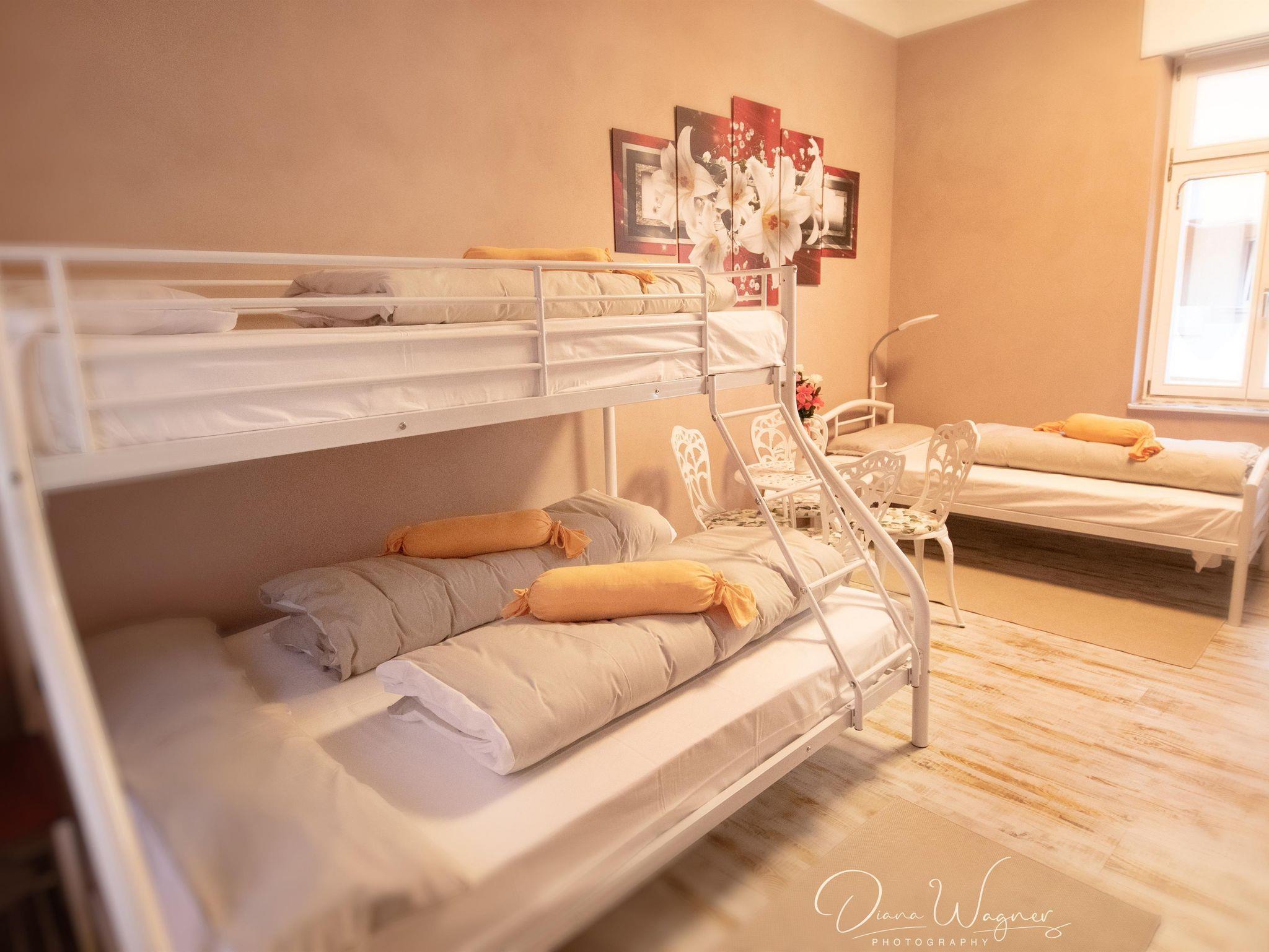 Die Bettenaufteilung ist wie folgt: ein Etagenbett (ein Doppelbett mit einem Einzelbett darüber) und zwei Einzelbetten.