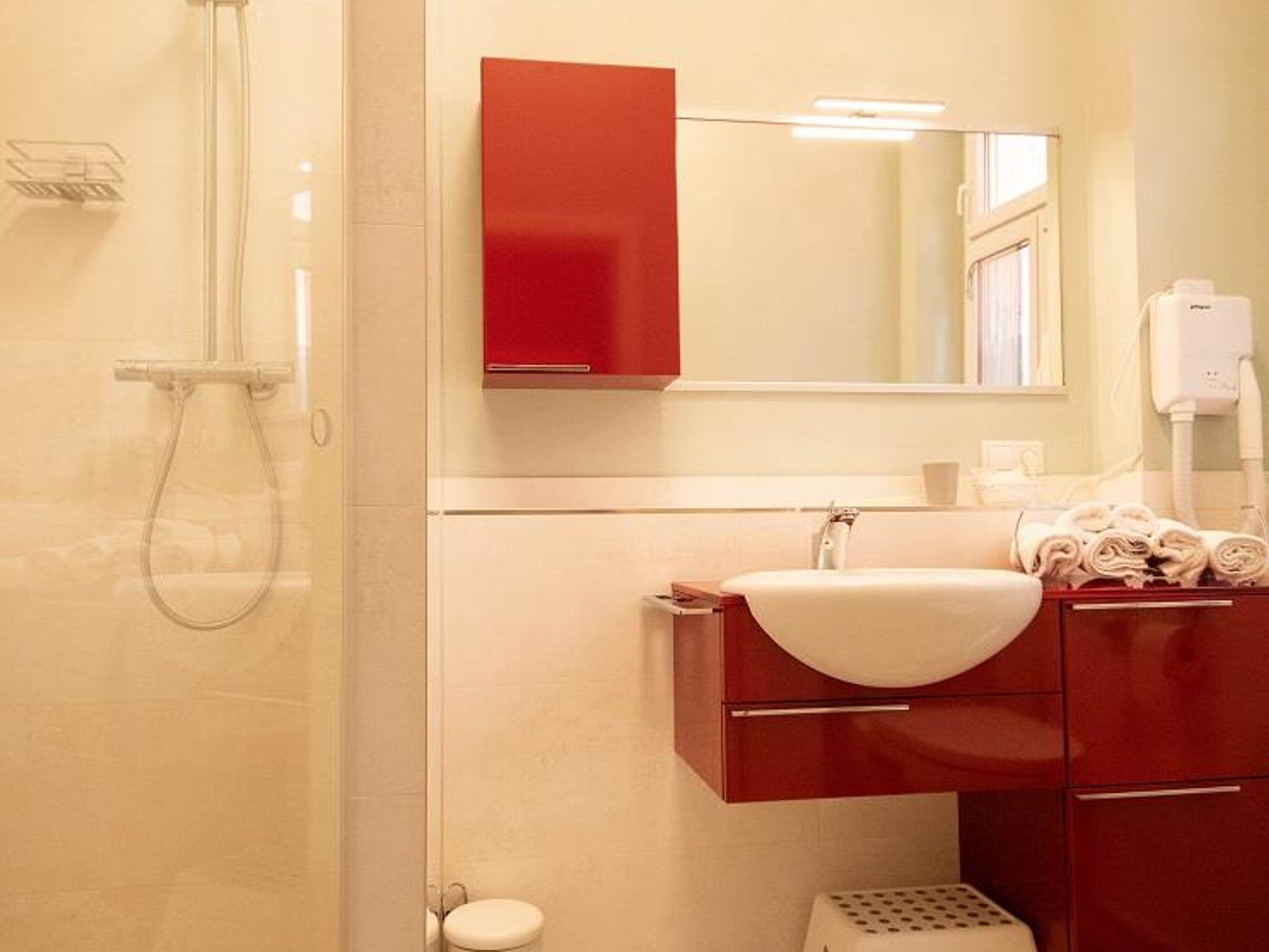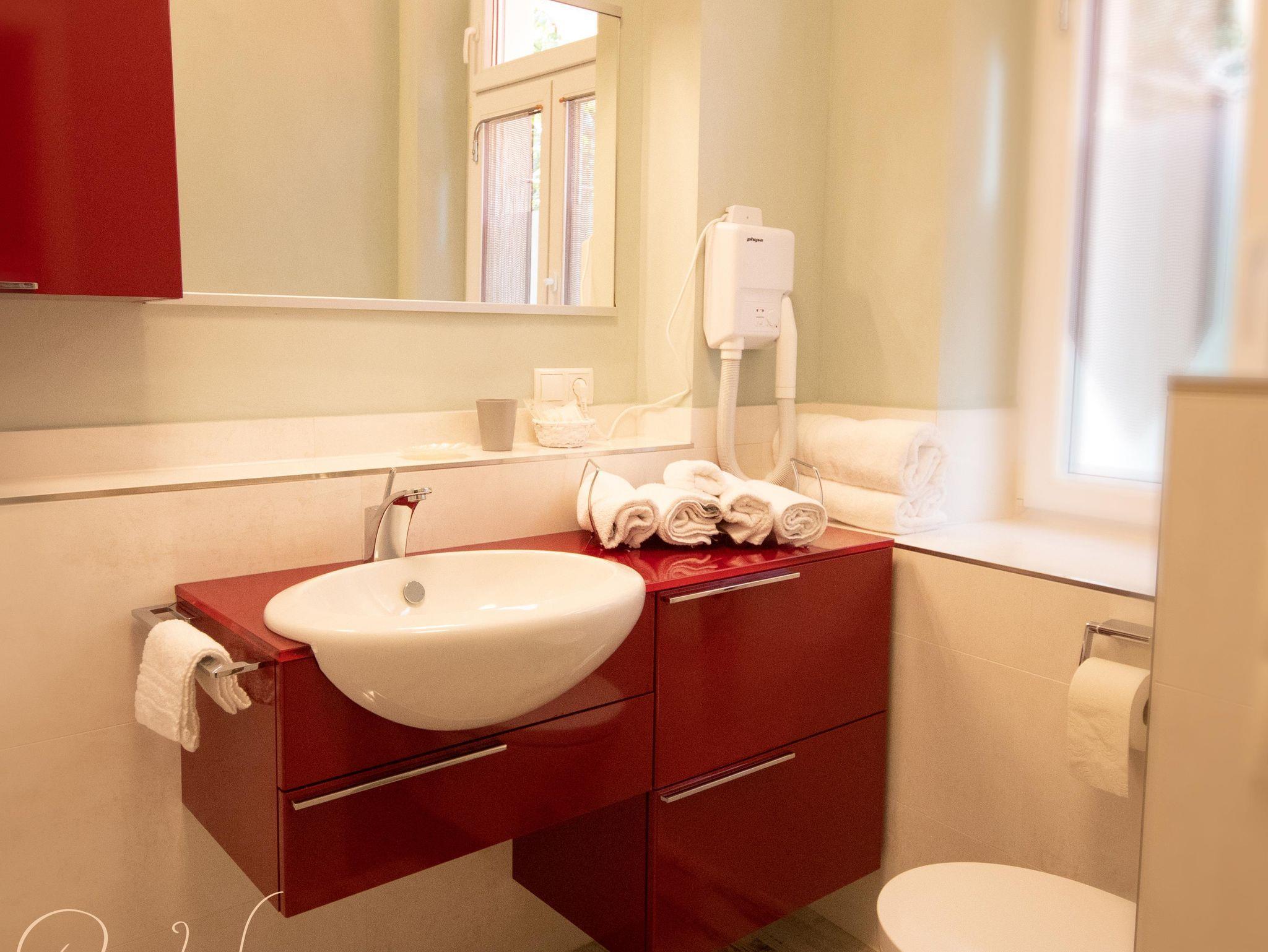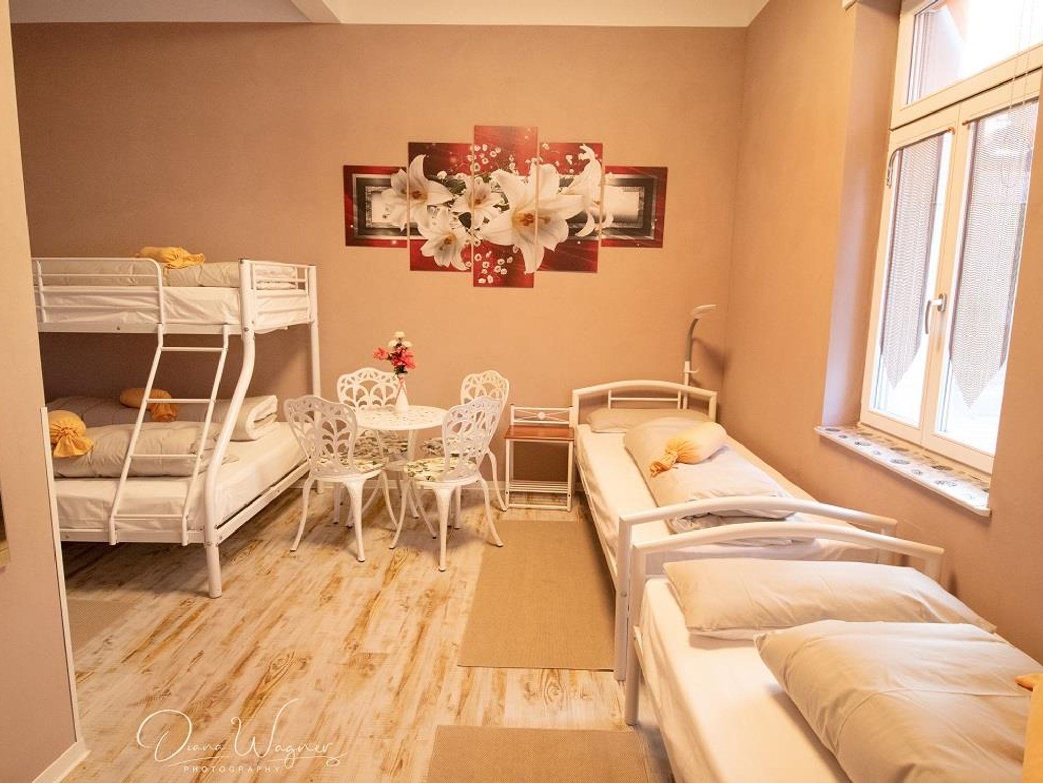 Unser geräumiges großes Familienzimmer für insgesamt fünf Personen befindet sich im zweiten Stock und verfügt über ein eigenes Bad sowie über eine Klimaanlage, einen Tisch mit vier Stühlen, einen Kleiderständer, einen Schrank und einen Fernseher.