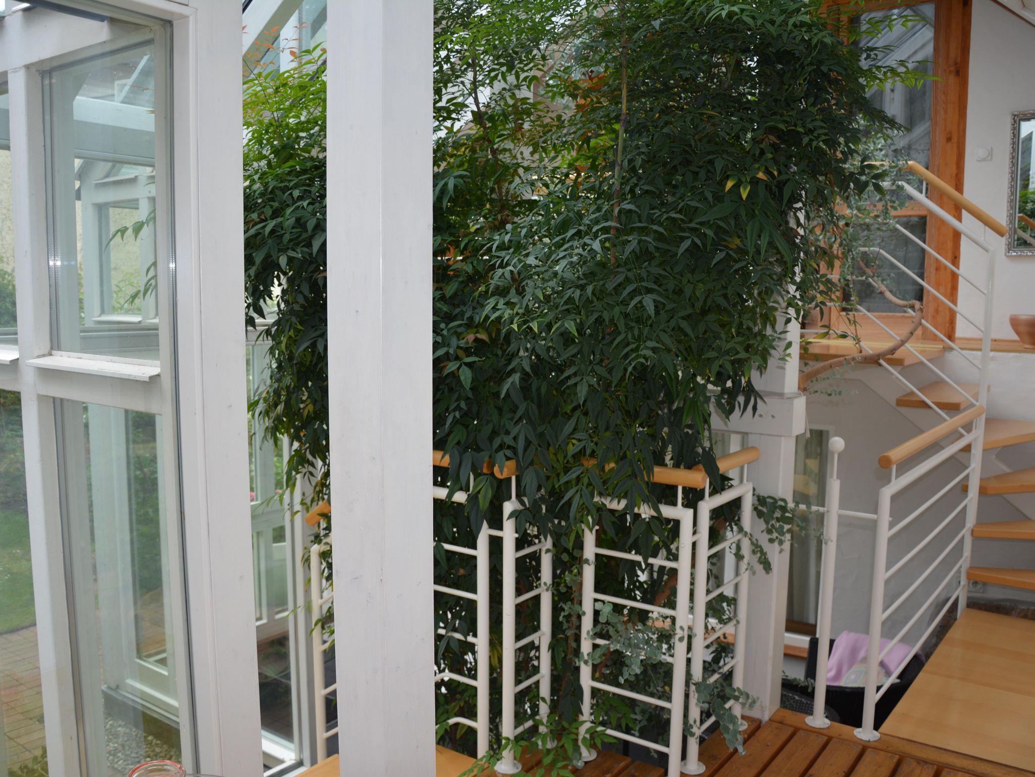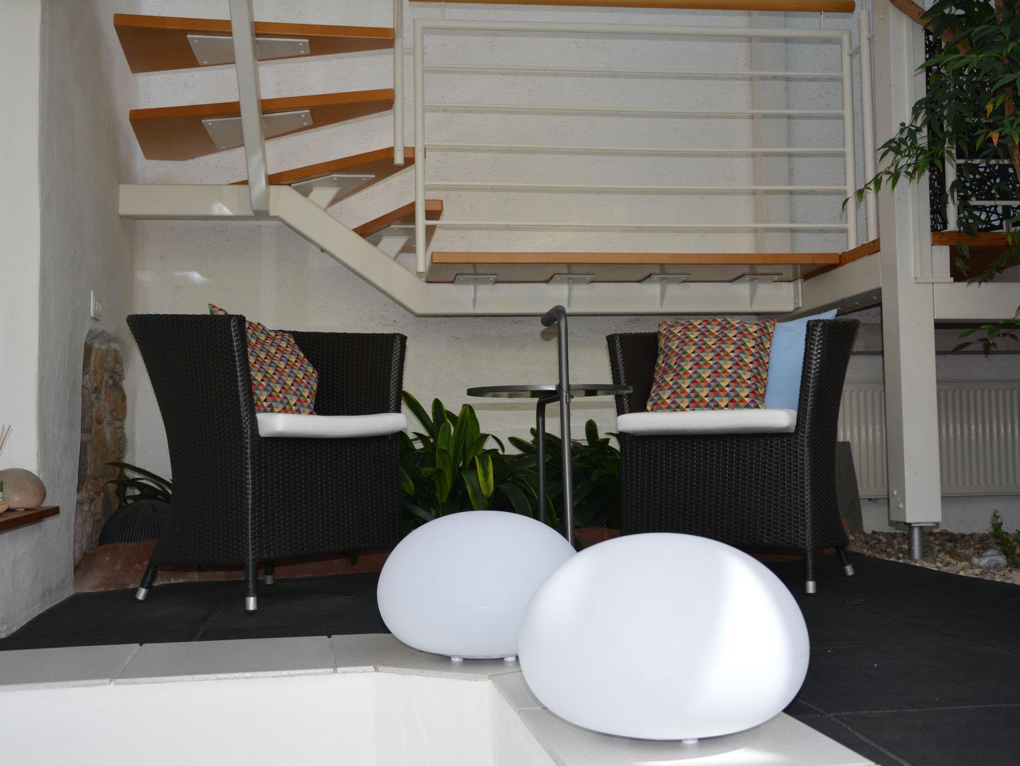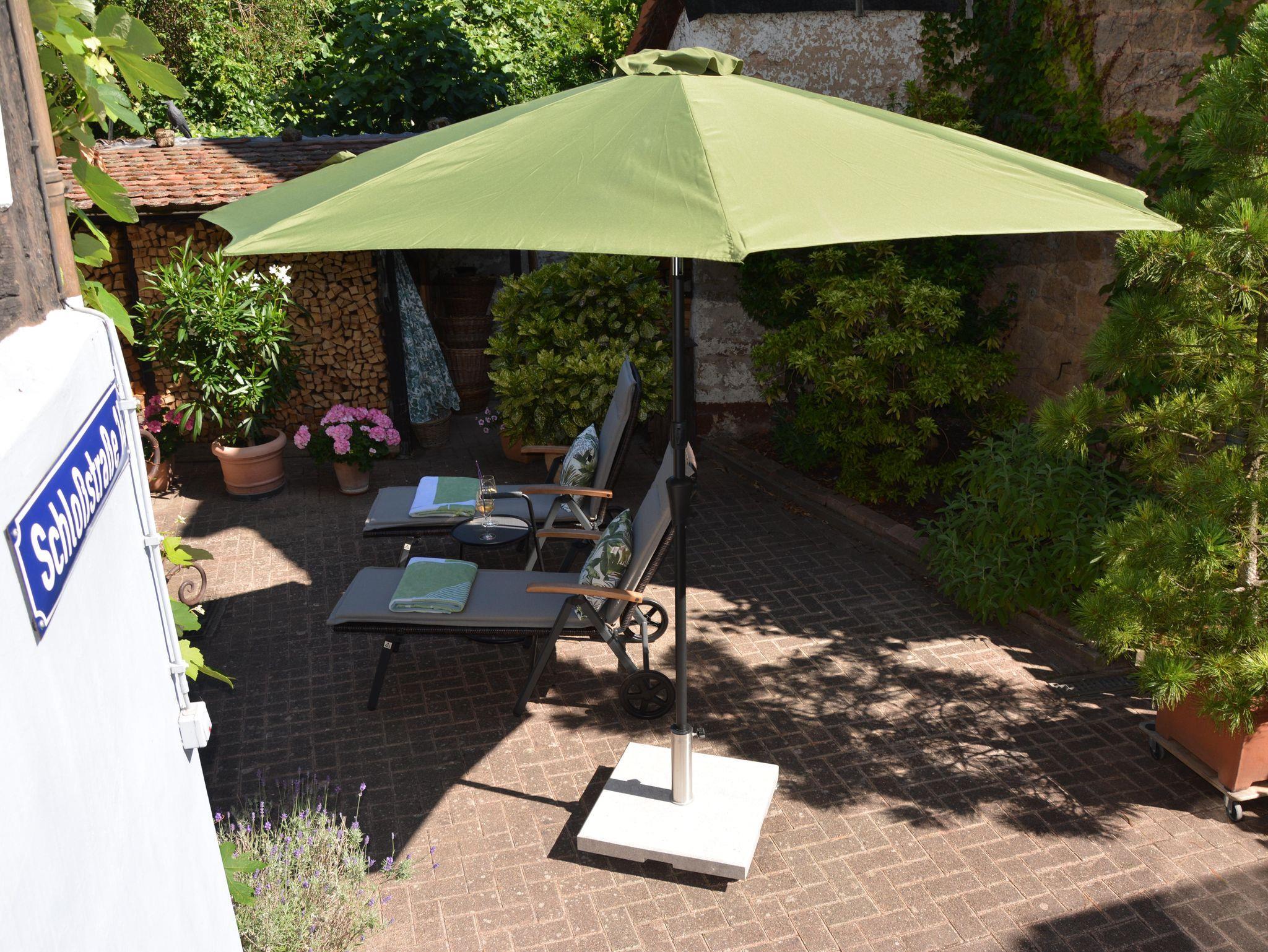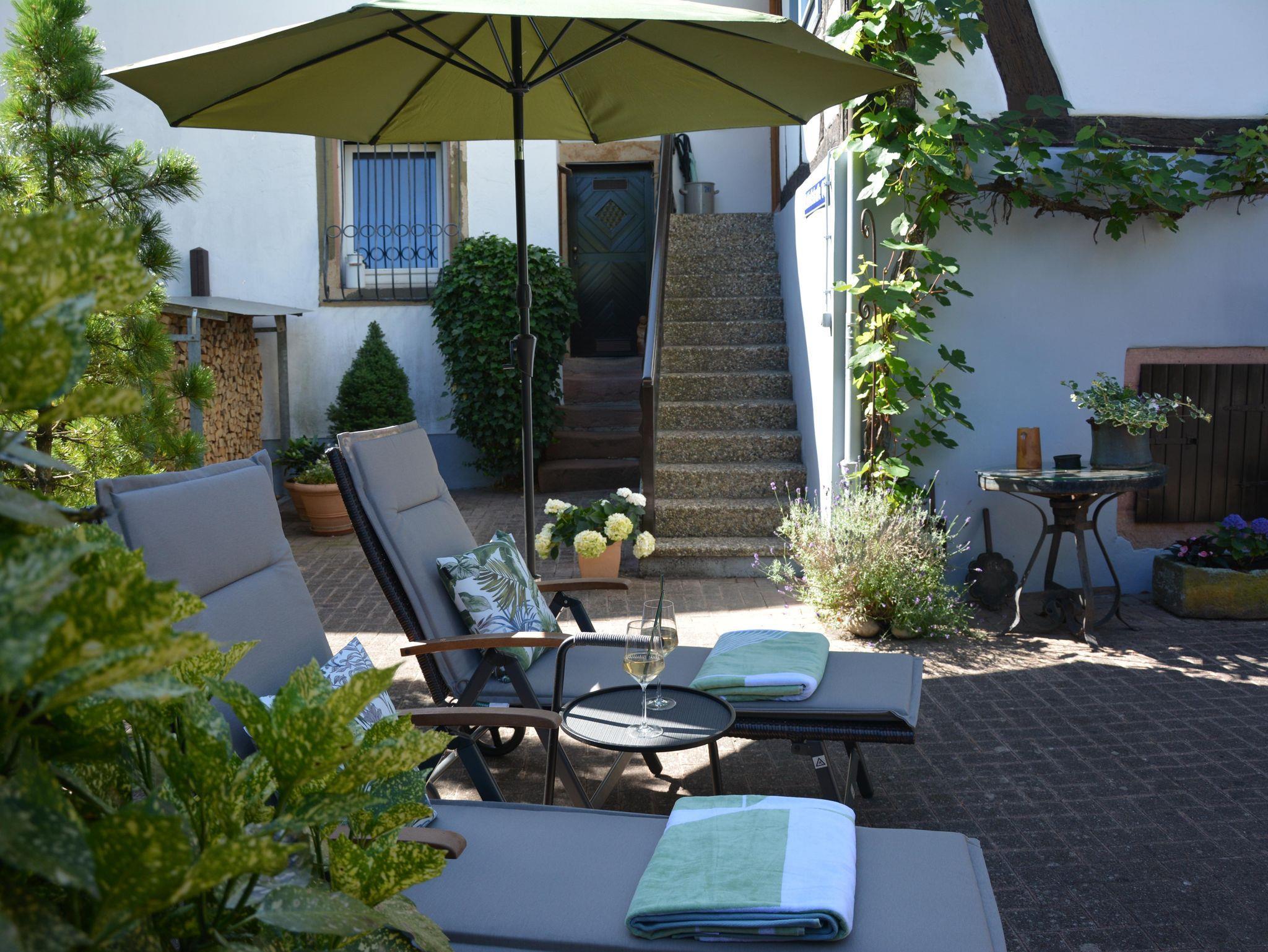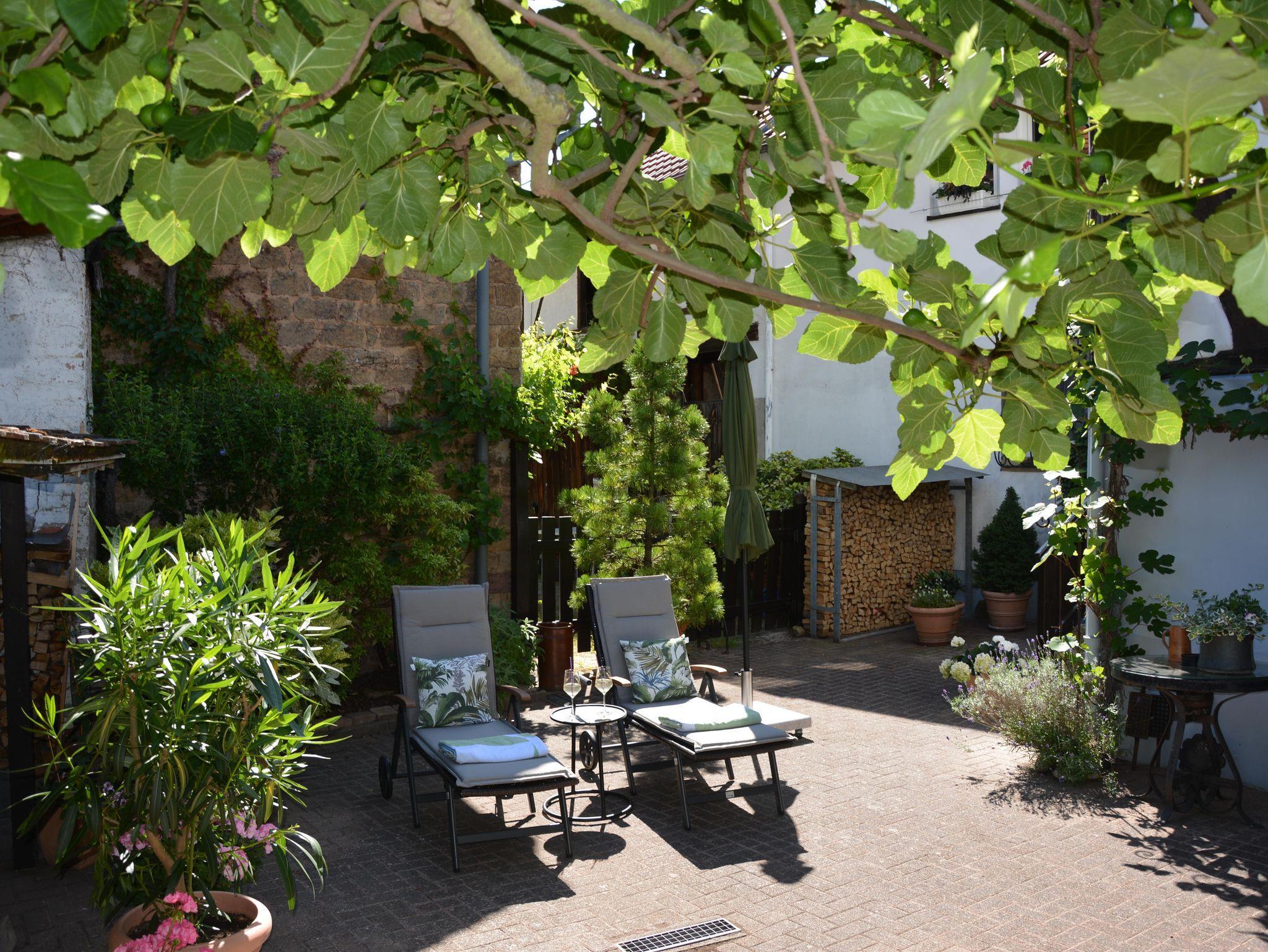 Die Entscheidung, das Anwesen in ein Gästehaus umzuwandeln, entsprang dem Wunsch, das einzigartige Ambiente dieses Hauses mit anderen Menschen zu teilen. Ein mediterran bepflanzter Innenhof sowie ein großräumiger Wintergarten mit direktem Blick zum Hambacher Schloss laden Sie ein zur Entschleunigung.