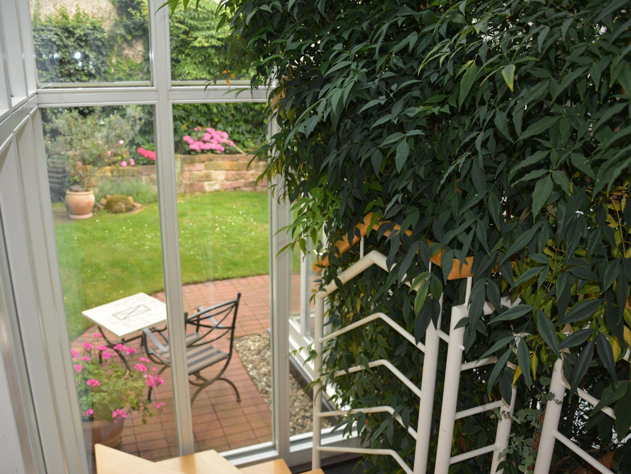 Der angegliederte Wintergarten bietet verschiedene Sitzbereiche und gewährt einen direkten Blick auf das historische Hambacher Schloss.
