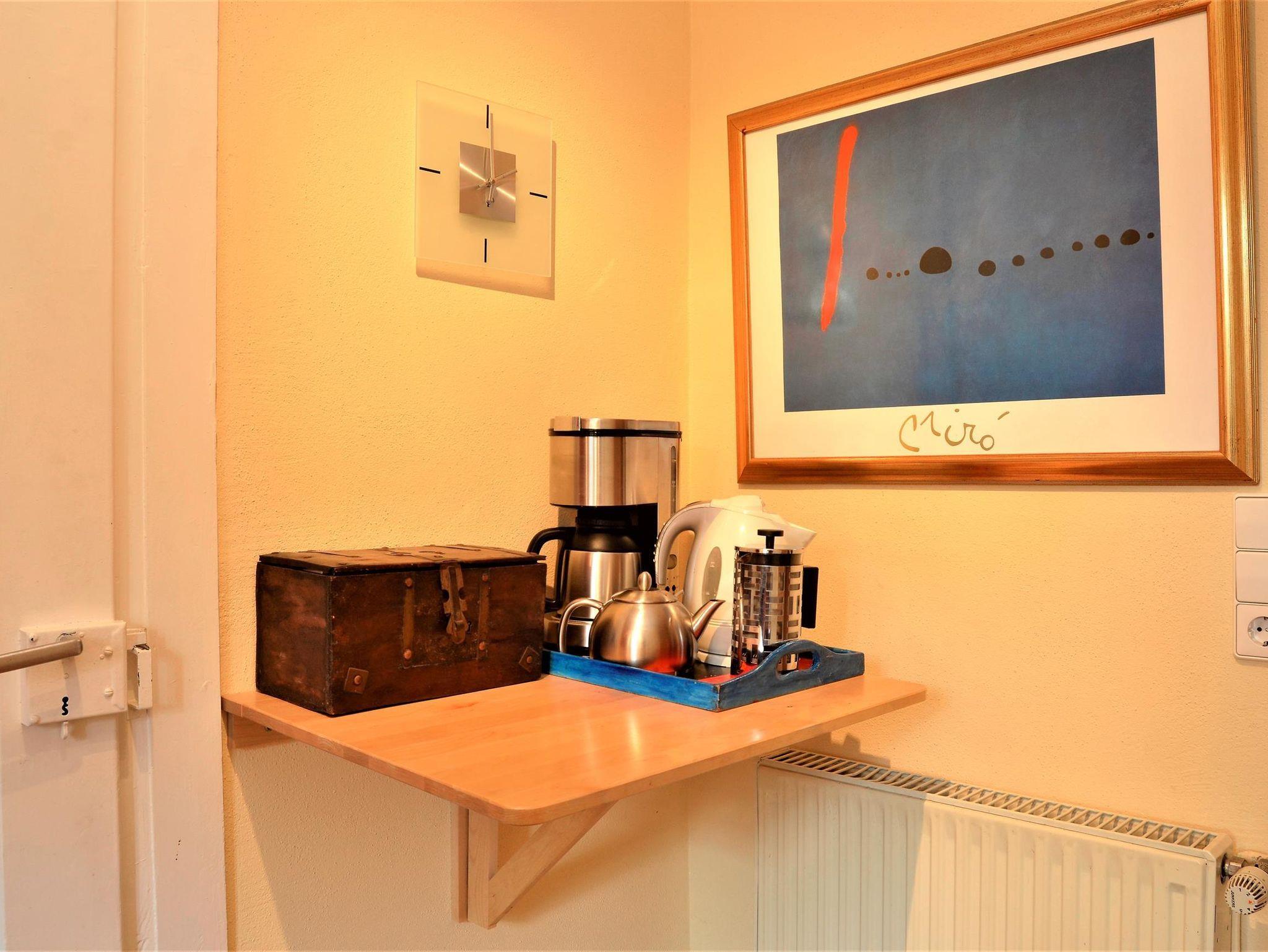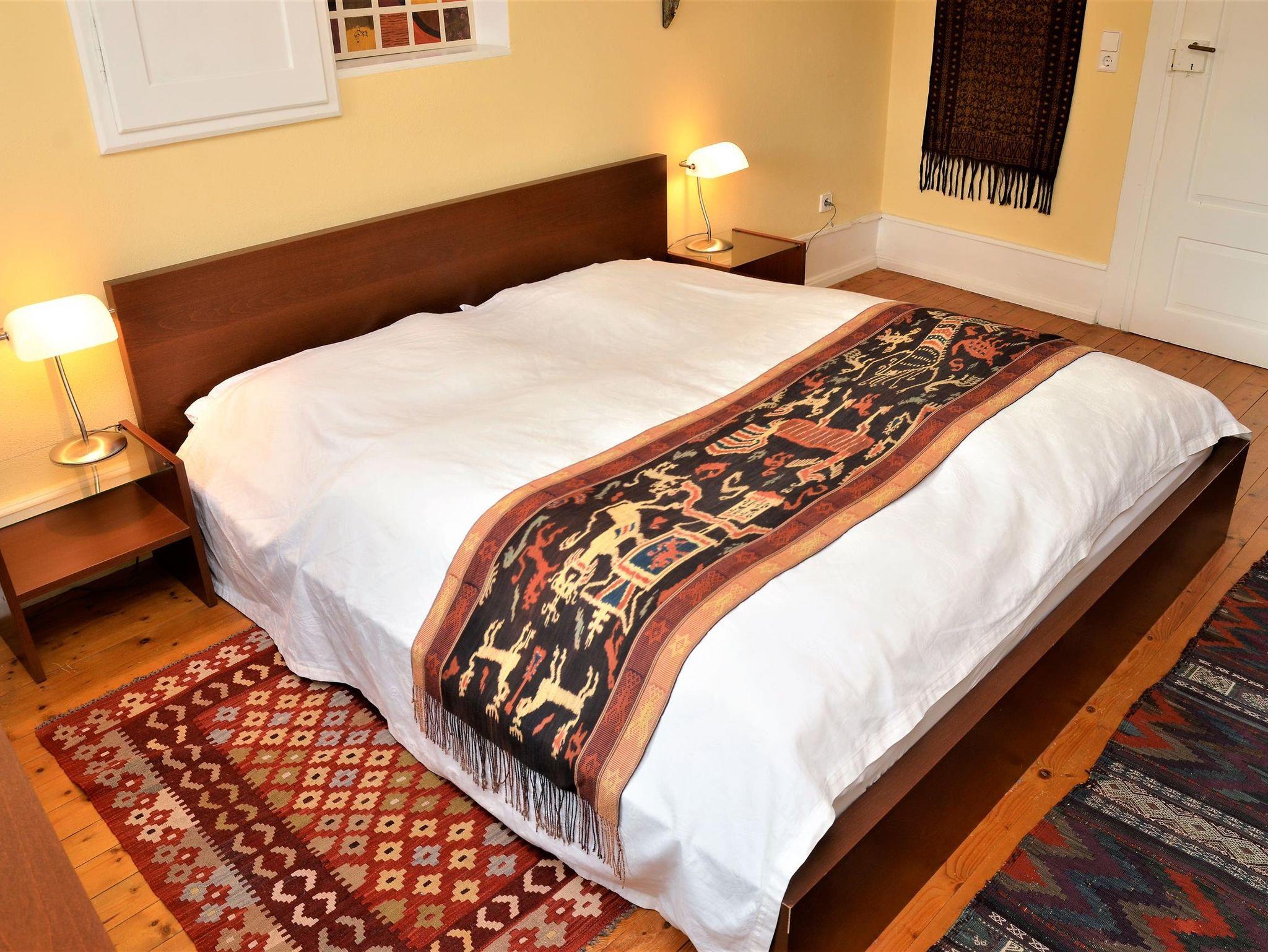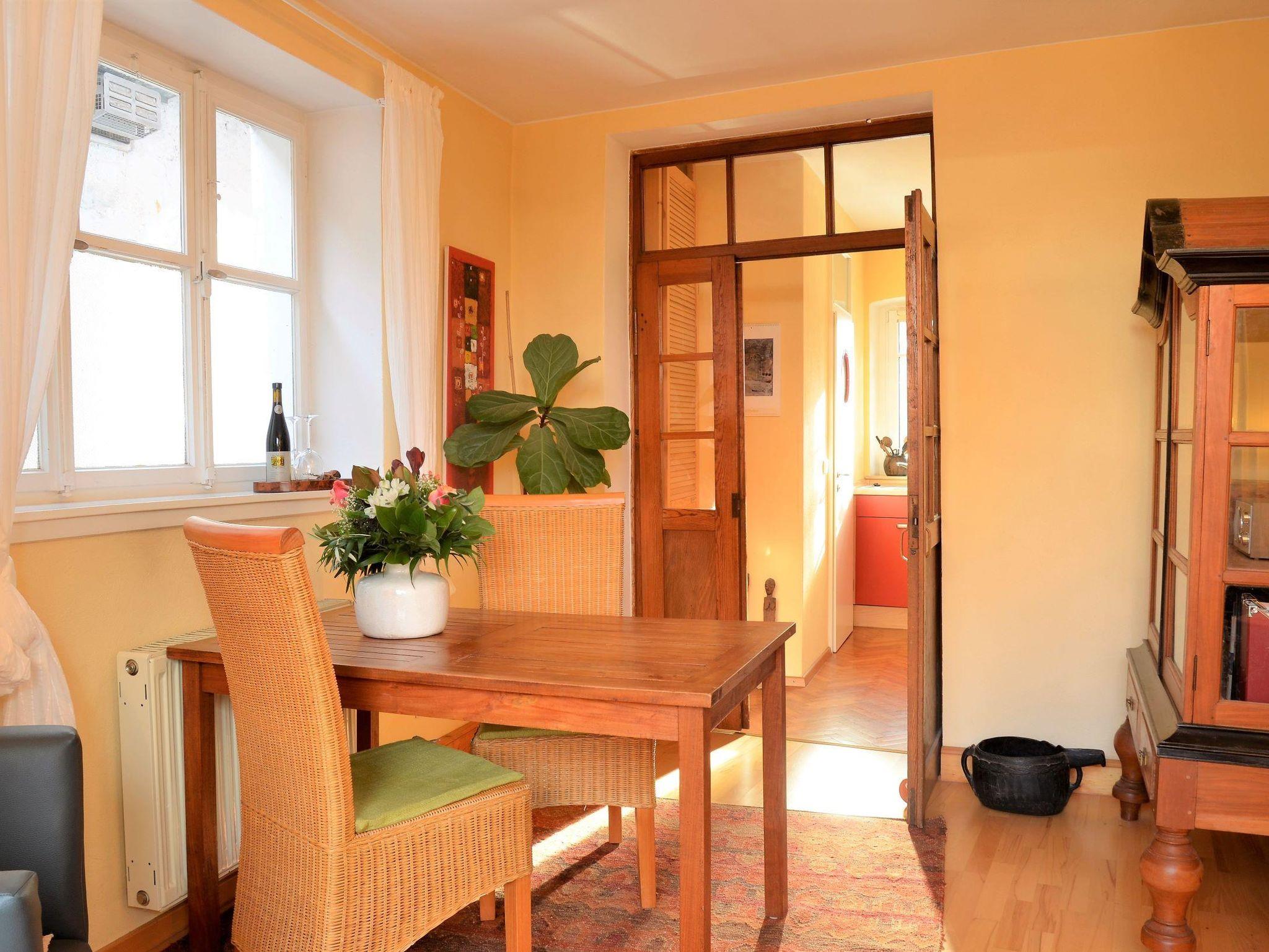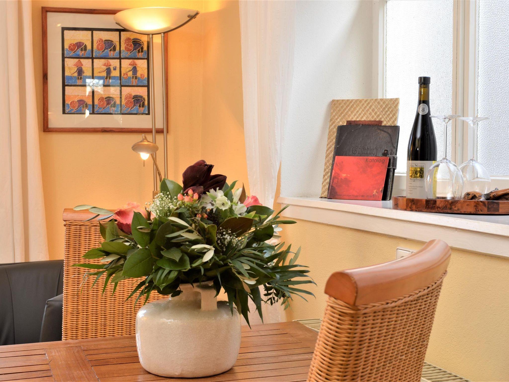 In der Fereinwohnung Mönchgarten im Erdgeschoss sorgen die gut erhaltenen hellen Holzböden und die warmen Wandfarben für eine gemütlichen Atmosphäre. Die Küche ist gut ausgestattet. Die Wohnung hat einen direkten Zugang zum idyllischen Hof. Hier lässt sich bei lauen Sommerabenden der Pfälzer Wein besonders gut genießen.
