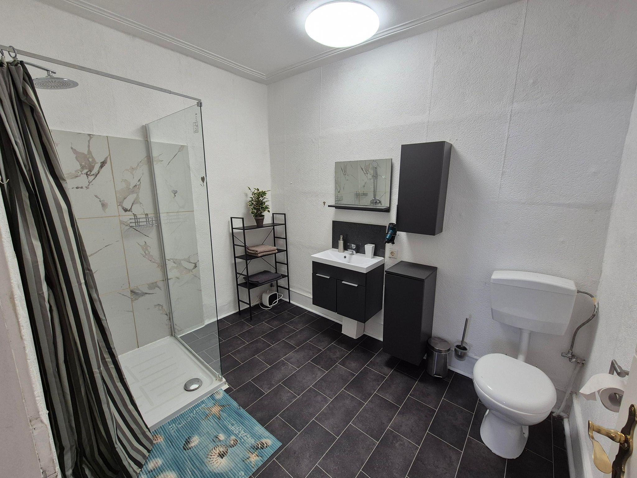 Badezimmer mit Dusche: Das Badezimmer ist modern und funktional gestaltet und verfügt über eine geräumige Dusche. Hier können Sie sich erfrischen und entspannen.