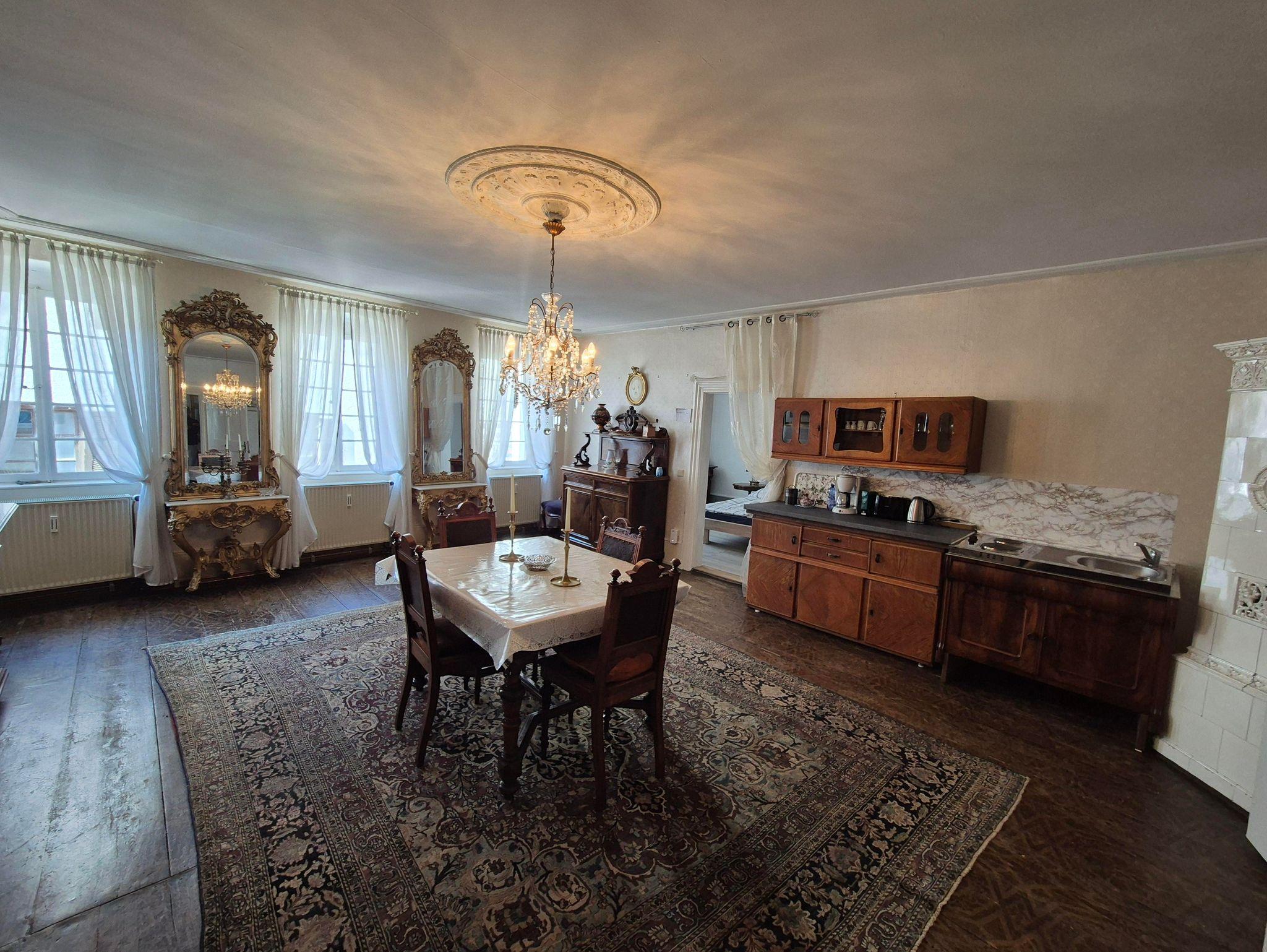 Wohnzimmer und Küche: Das Wohnzimmer und die Küche sind miteinander verbunden und bieten einen gemütlichen Raum, um Zeit miteinander zu verbringen. Das Wohnzimmer strahlt den Flair des 19. Jahrhunderts aus und lädt zum Entspannen ein. Hier können Sie sich in die Vergangenheit zurückversetzt fühlen, während Sie gleichzeitig modernen Komfort genießen.