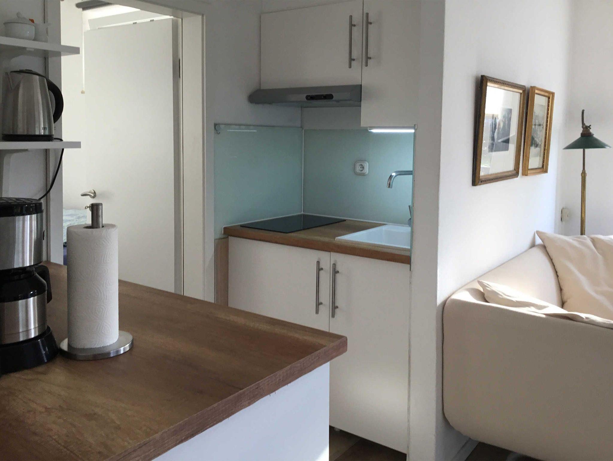 Individuell und gemütlich eingerichteter kleiner Nichraucher-Bungalow mit Terrasse und Gartenbenutzung. Hier trifft Antik auf Modern. Gemütliche Essecke mit Blick auf den kleinen Gartenteich, Fernsehbereich mit Schlafsofa und Sessel, kleine Küchenzeile mit 2-Plattenherd, Backofen, Kühlschrank, Spüle etc. An den Wohnbereich grenzt das Schlafzimmer mit französichem Bett (1,60 x 2 m).