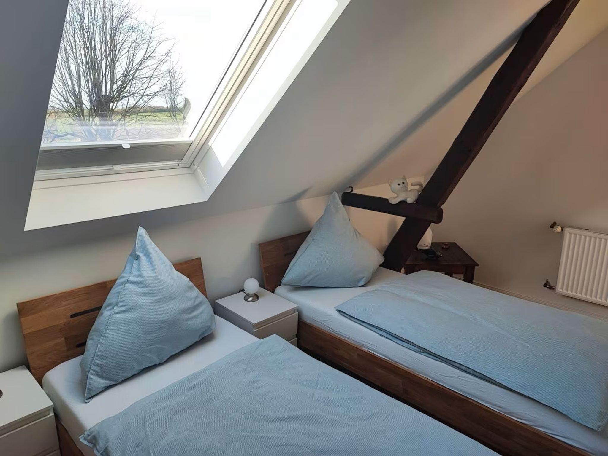 Die Ferienwohnung auf dem Lande für bis zu 4 Personen (plus 1 Kleinkind bis 2 Jahren) befindet sich im Obergeschoss des Haupthauses. Alte freiliegende Balken und eine moderne Einrichtung sorgen für ein charmantes Ambiente.