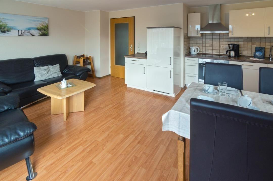 Zentrum der Unterkunft ist der offen gestaltete Wohnraum, welcher neben einladenden Polstermöbeln auch genügend Platz für den Esstisch und die Küche der Wohnung bietet. Hier können Sie mit Freude kochen, gemeinsam Essen oder entspannte Abende genießen. Selbstverständlich steht auch ein Fernseher zur Verfügung, so dass für eine abwechslungsreiche mediale Unterhaltung gesorgt ist. Das Zimmer ist wunderbar hell und lichtdurchflutet. Sie haben von hieraus zudem Zugang zum Balkon der Wohnung.