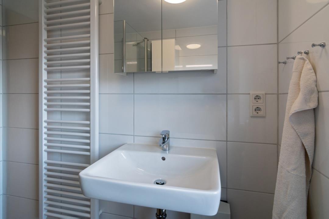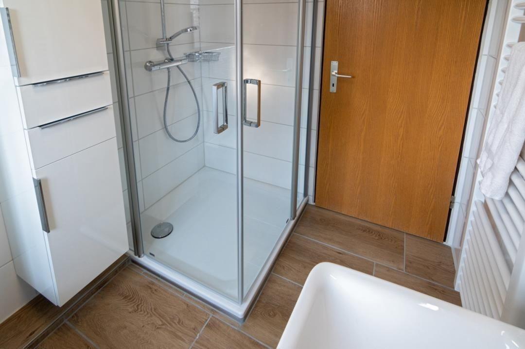 Komplettiert wird die Wohnung durch das kleine Badezimmer. Es handelt sich um ein Duschbad, dessen Dusche durch ein WC und eine Waschkombination mit Spiegel ergänzt wird.