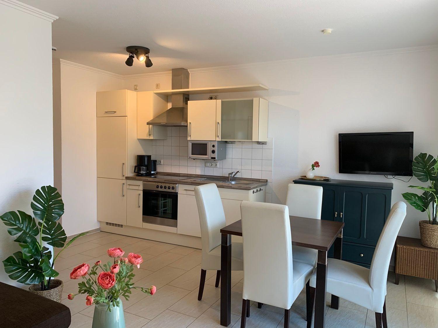 Die ca. 50 qm große EG-Wohnung hat einen modernen Wohn- und Essbereich. Ein gemütliches Zusammensein mit der ganzen Familie ist auf der bequemen und modernen Wohncouch möglich. Von hier aus können Sie die Nachrichten des Tages auf dem Flachbildschirm-TV verfolgen.
