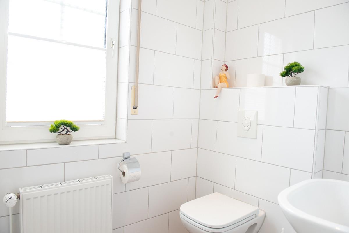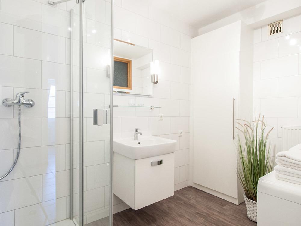 Ebenfalls im 1. OG befindet sich das moderne Bad mit Dusche und ein getrenntes WC