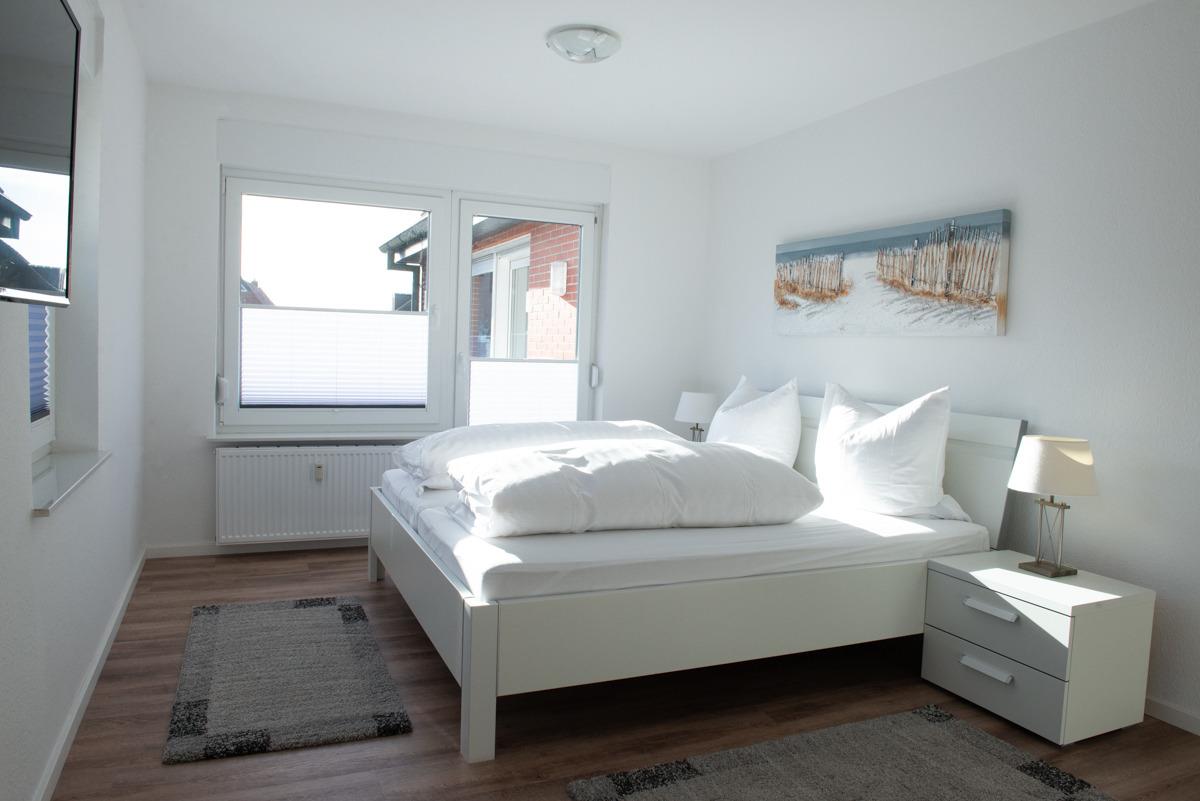 Die Ferienwohnung Deichnähe E liegt im 1.OG, verfügt über zwei getrennte Schlafzimmer, davon ist ein Schlafzimmer mit Doppelbett, Sat/TV, Außenrolladen und das zweite Schlafzimmer mit einem weiteren Doppelbett und Verdunklungs.-Plissees ausgestattet.