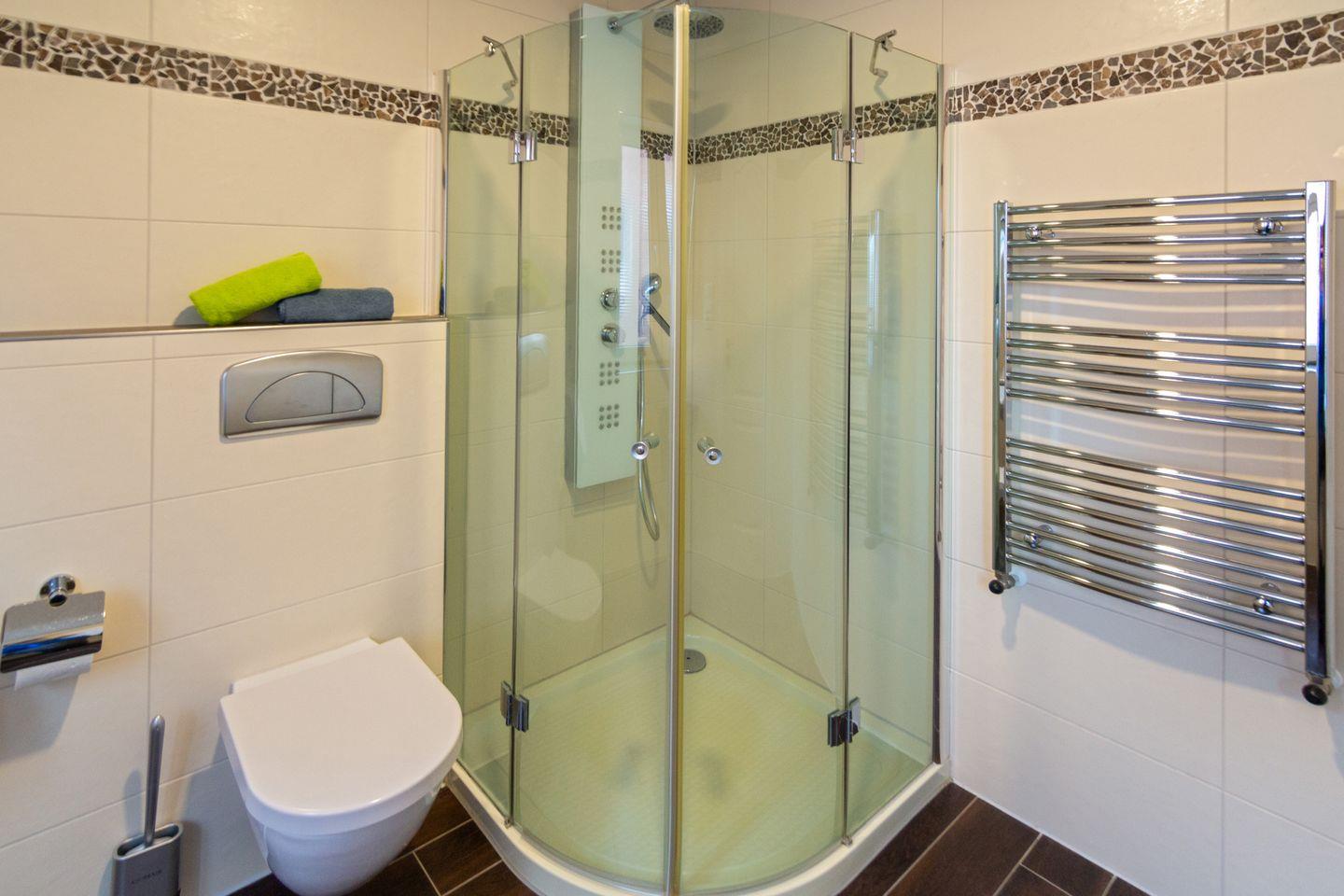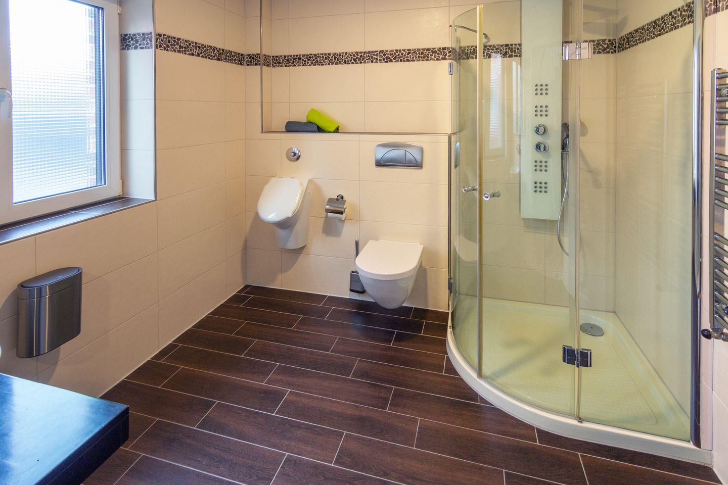 Das Badezimmer im Erdgeschoss verfügt über eine Eck-Massagedusche mit niedrigem Einstieg, Urinal, wandhängendes WC, Waschbecken, Handtuchheizkörper, wandhängender Kosmetikmülleimer und Fenster mit Außenjalousien.