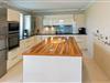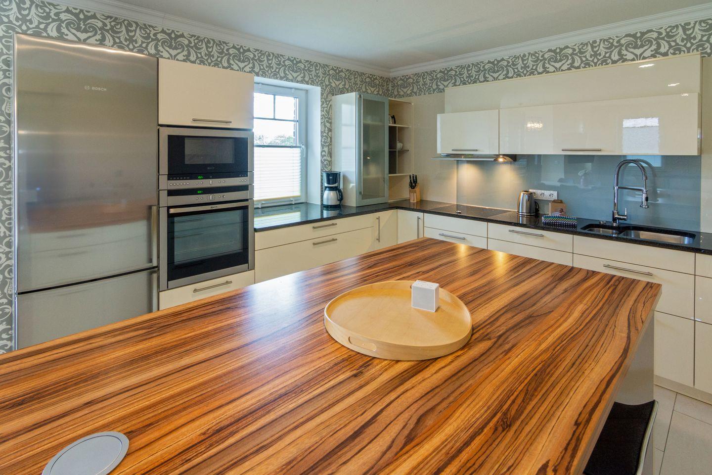 Die Küche verfügt über alle modernen technischen Geräte und bietet viel Stauraum. An der Kochinsel stehen zwei Barhocker.