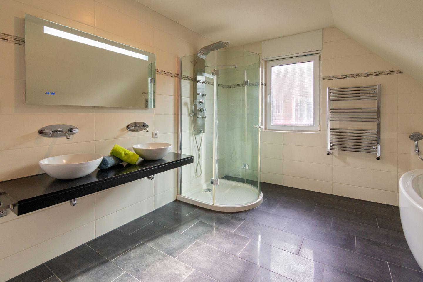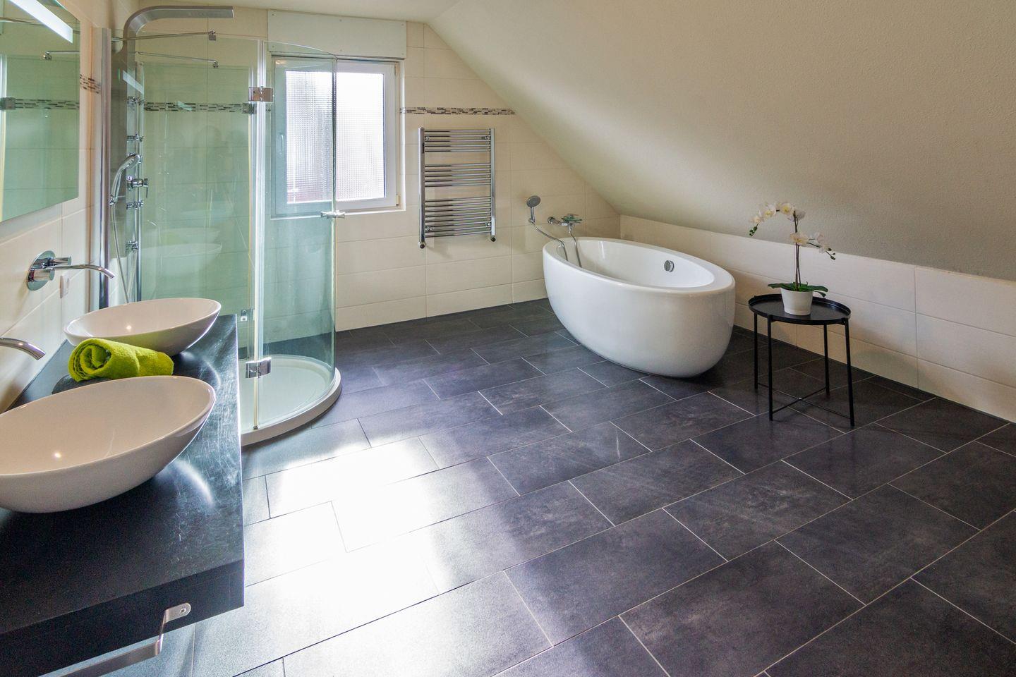 Das Badezimmer im Obergeschoss ist traumhaft groß. Mit ca. 20 qm bietet es eine frei stehende Badewanne, ein wandhängendes WC, wandhängender Kosmetikmülleimer und eine Massagedusche mit niedrigem Einstieg sowie ein großes Doppelwaschbecken. Durch das Fenster gibt es genügend Tageslicht.