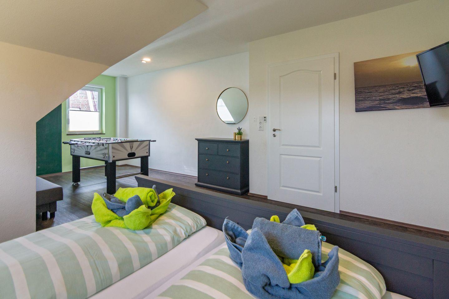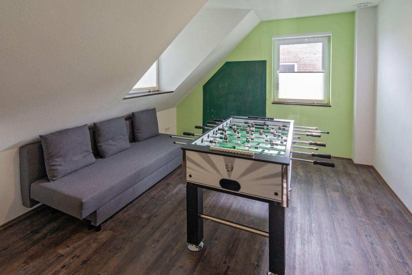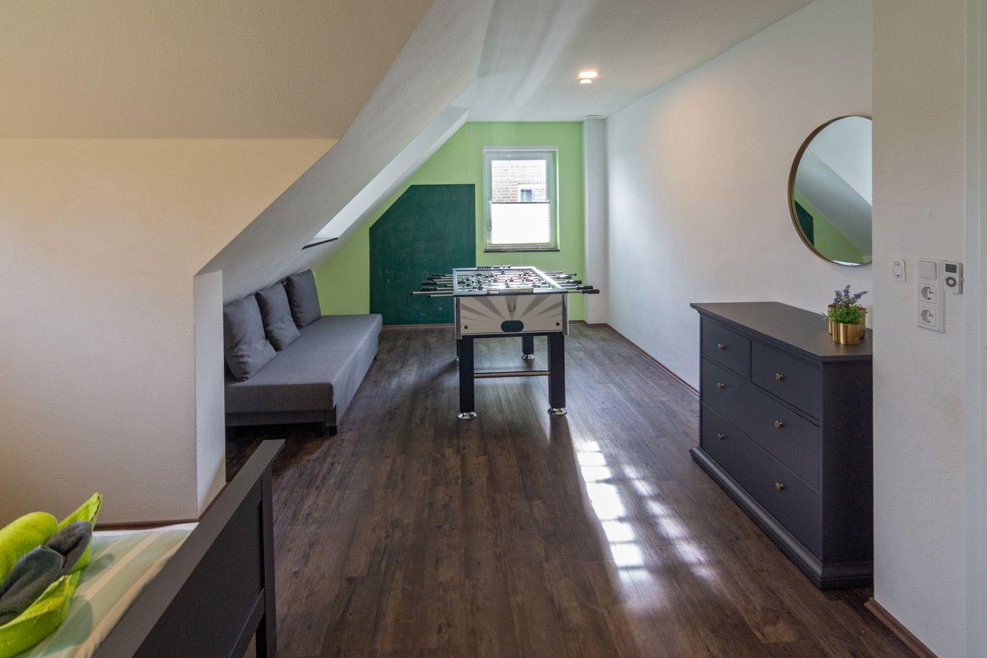 Tischkicker, elektrische Jalousien, begehbarer Kleiderschrank, WLAN und Parkplatz. Waschmaschine gegen Gebühr.
