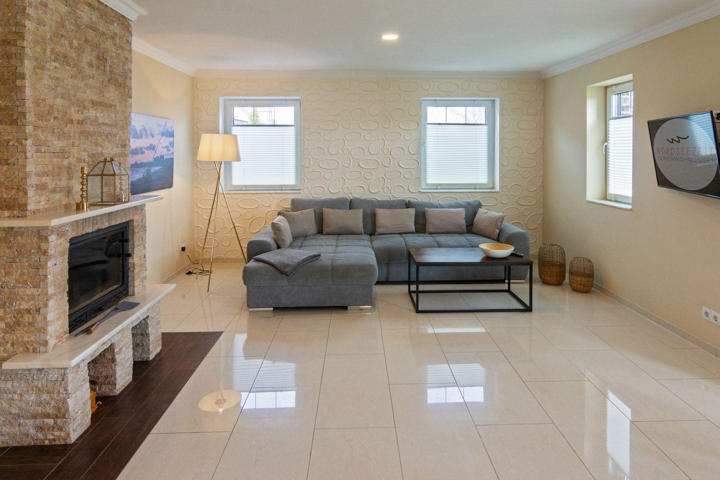 Im Wohnzimmer befindet sich eine gemütliche Sofaecke, TV und ein Kamin für gemütliche Stunden.