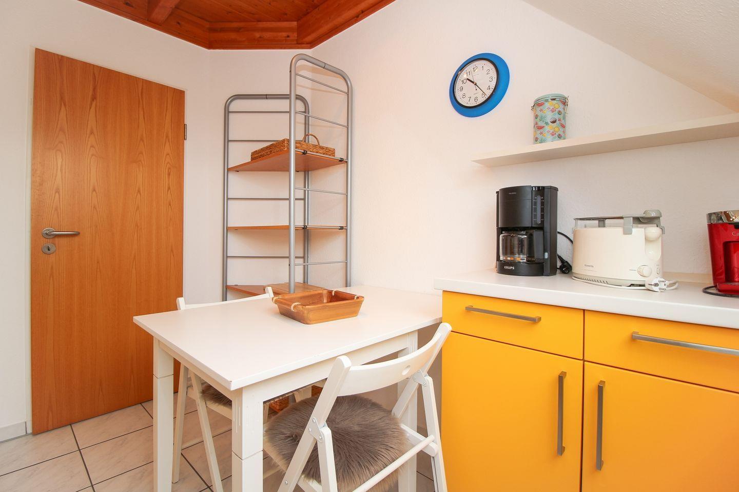 Der Wohnbereich ist mit einer gemütlichen Sofaecke, einem Sessel sowie TV ausgestattet und lädt zum Verweilen ein. Ein Esstisch bietet ausreichend Platz für gemeinsame Mahlzeiten. Die offene Küche ist umfangreich eingerichtet und enthält neben einem Ceran-Herd, einer Spülmaschine und einem großen Kühlschrank mit Gefrierfach auch Kleingeräte wie Toaster, Wasserkocher und Kaffeemaschine.