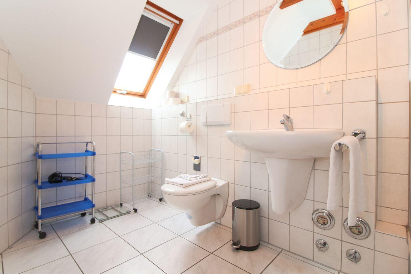 Das Bad bietet eine praktische Eckdusche, ein WC sowie ein Fenster, das für angenehmes Tageslicht sorgt.