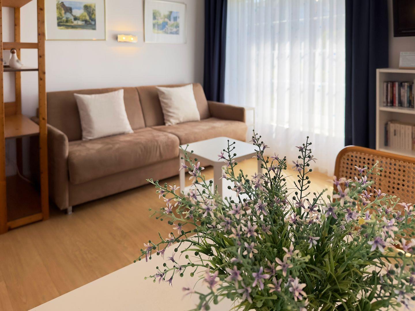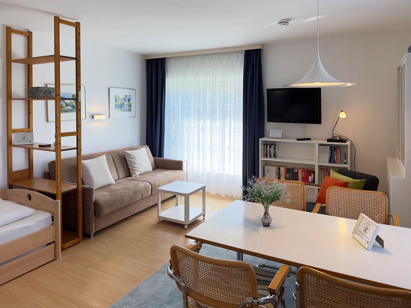 Die gemütliche Einrichtung ist gut geeignet für Alleinreisende, zusammenreisende Freund:innen oder Pärchen. Durch die zwei unterschiedlichen Schlafmöglichkeiten, Einzelbett und Doppel-Schlafsofa (160 x 200), hat man die volle Flexibilität zur Nutzung der Wohnung. Das Schlafsofa verfügt über Lattenrost und eine neue Matratze und ist mit zwei Handgriffen schnell und einfach bereit für die Nacht.