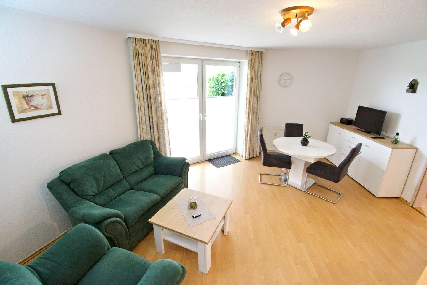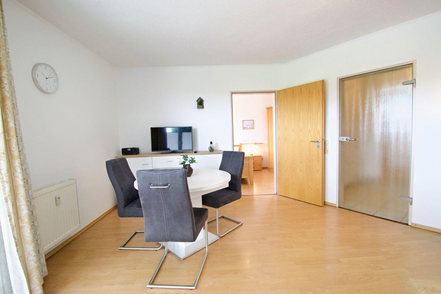 Die gemütliche Ferienwohnung bietet eine Wohn- und Wohlfühlfläche von mindestens 45?m² – ideal für Paare oder die kleine Familie. Der vollständig mit Laminat ausgelegte Wohn- und Essbereich sorgt für eine angenehme Atmosphäre und ist pflegeleicht zugleich. Die Wohnung liegt zentral und dennoch ruhig, direkt hinter dem Deich, sodass Sie sowohl Erholung als auch kurze Wege genießen können.
