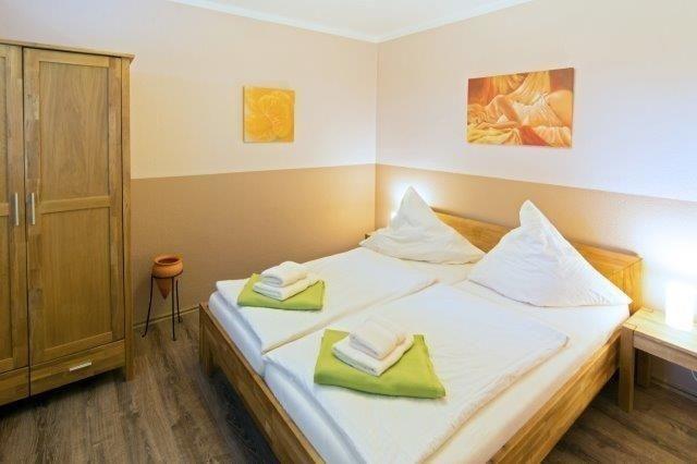 Das separate Schlafzimmer der Wohnung bietet mit zwei Gästen eine gemütliche Schlafgelegenheit im vorhandenen Doppelbett.