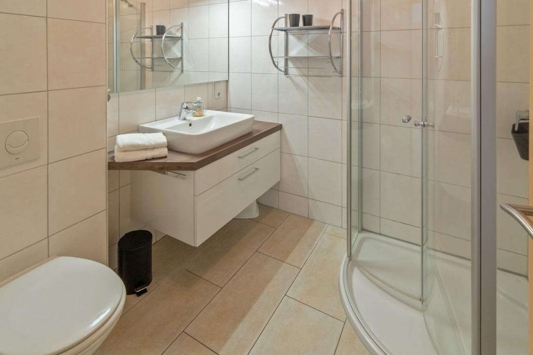 Auch das Badezimmer bietet Ihnen allen wünschenswerten Komfort. Eine bodennahe Eckdusche, WC und Waschkombination mit Spiegel gehören ebenso zur Ausstattung des Bades wie ein Duschhocker und ein Föhn.