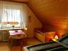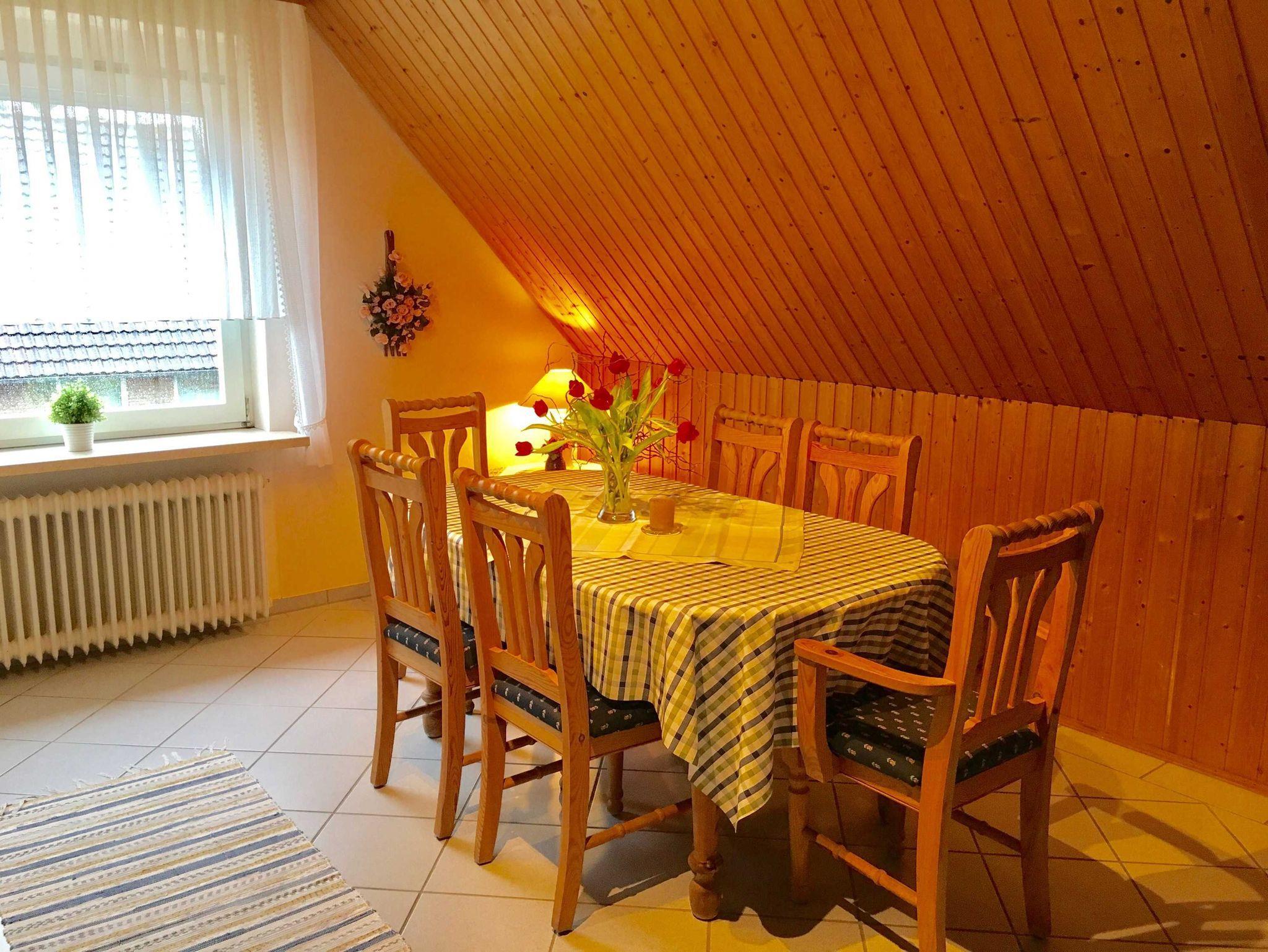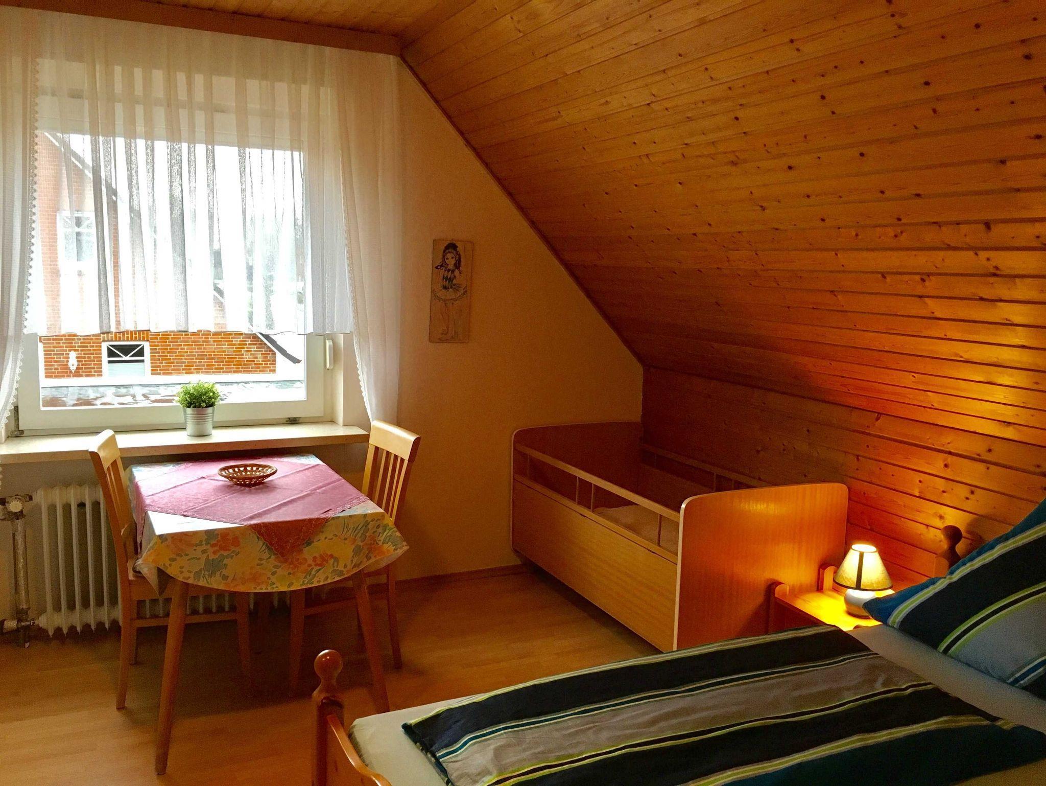 Kinderbett. Das Wohnzimmer mit Esstisch ist hell und freundlich