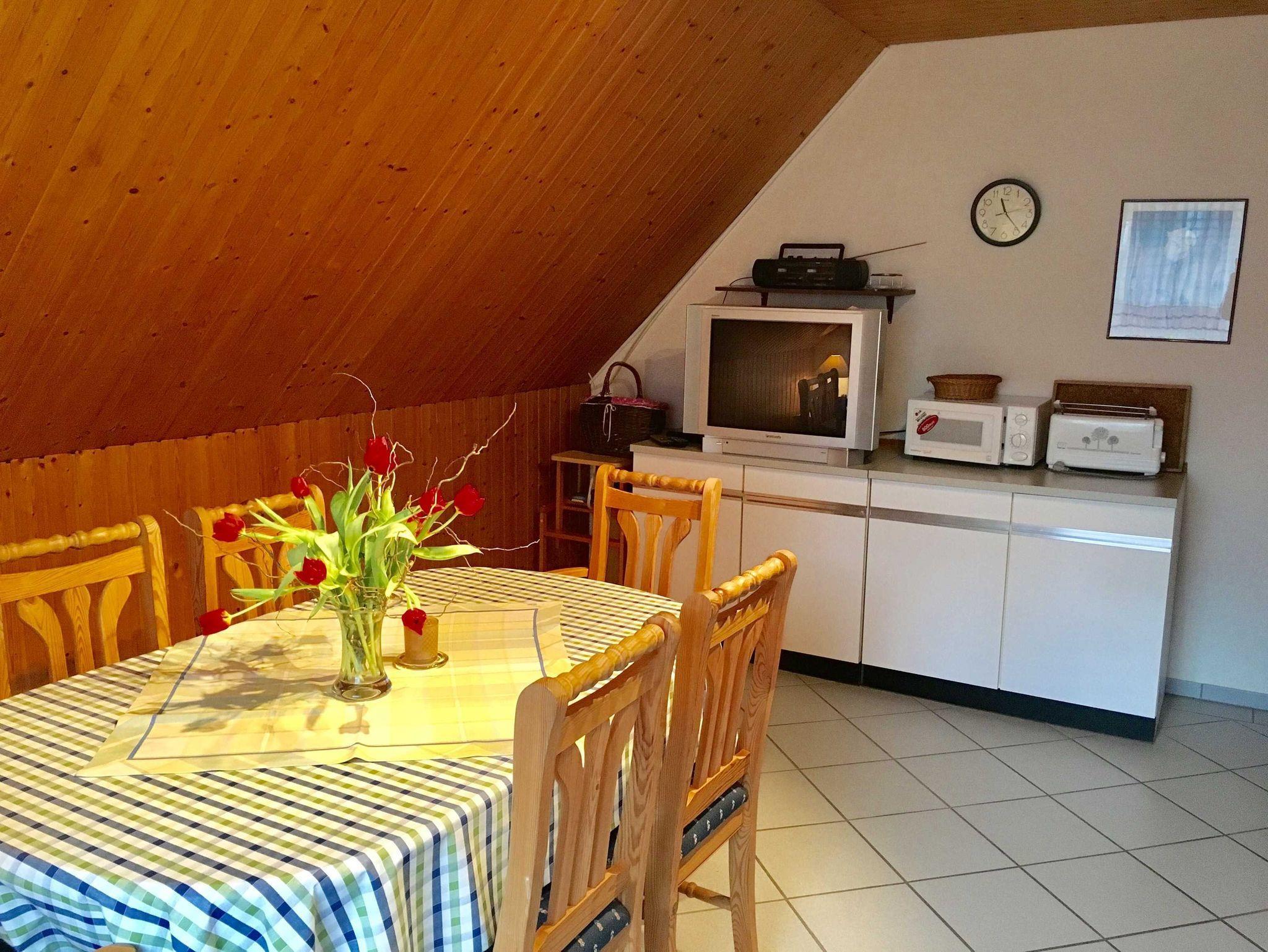 Die Wohnung ist aufgeteilt in 2 Schlafzimmer eines davon mit Kinderbett. Das Wohnzimmer mit Esstisch ist hell und freundlich eingerichtet. Die große Wohnküche ist mit allen wichtigen Untensilien eingerichtet und bietet Ihnen genug Platz, ein 2. Fernseher ist in der Küche vorhanden.