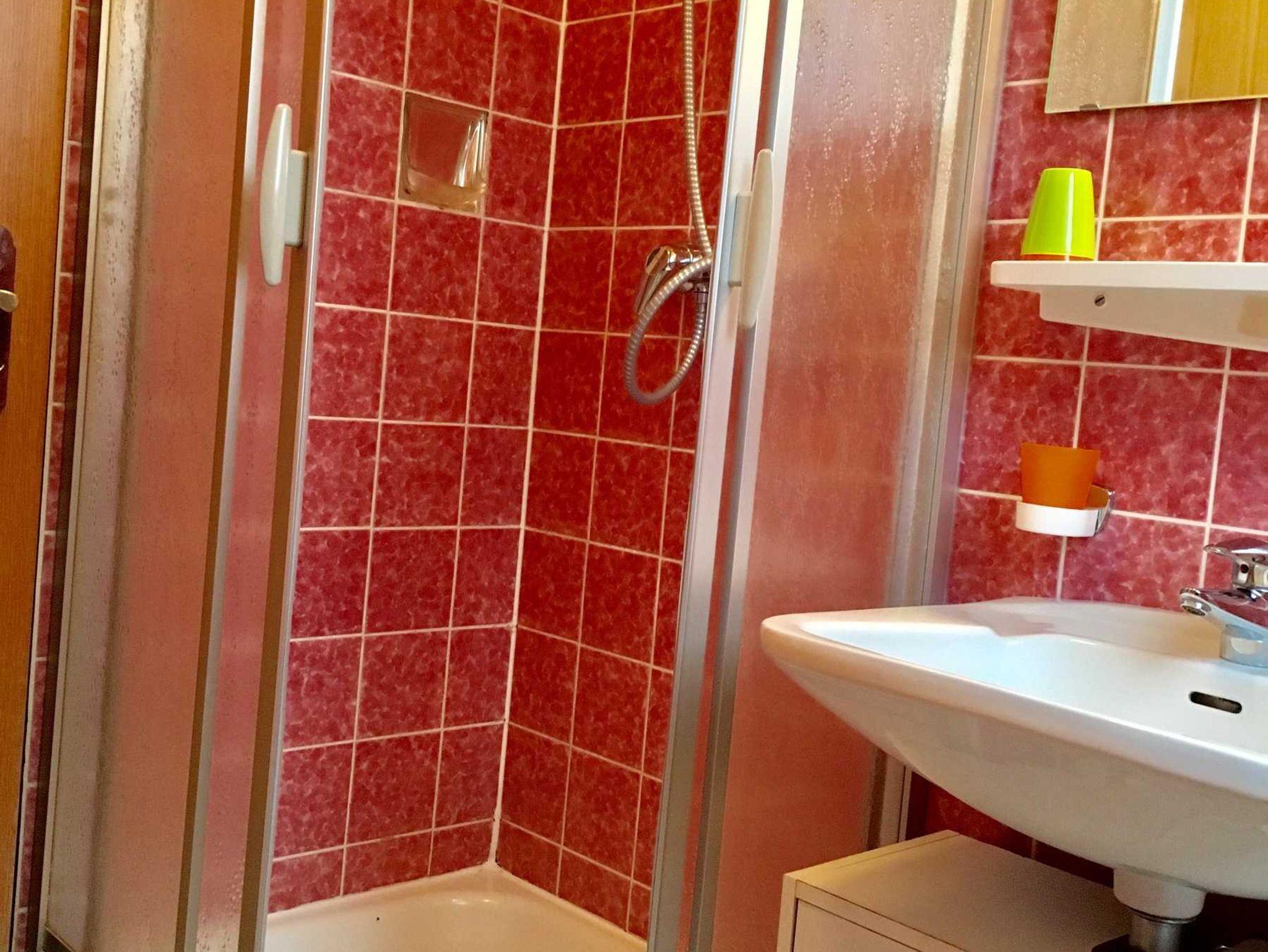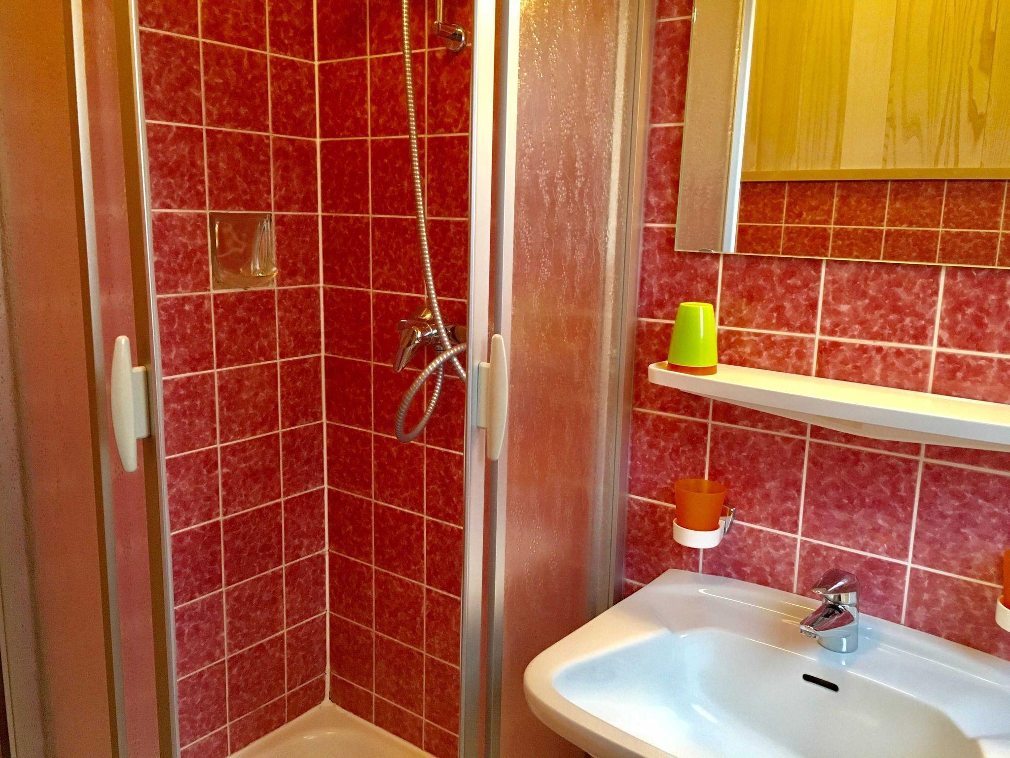 Das Badezimmer ist mit einer Dusche, WC und Handwaschbecken ausgestattet.