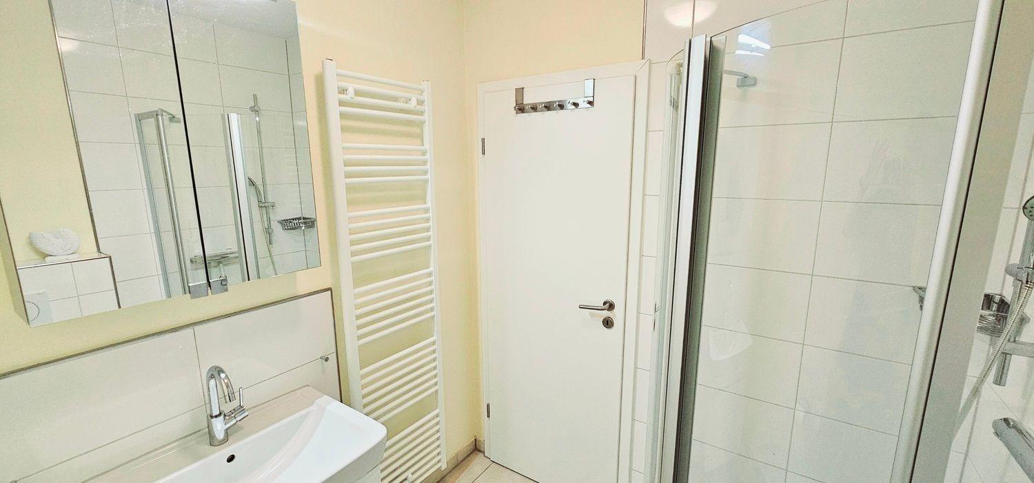 Die Meerraum bietet Ihnen zwei Badezimmer. Eins davon befindet sich im Erdgeschoss und das andere im Obergeschoss. Durch das große VELUX Fenster wird das Badezimmer im OG mit viel Tageslicht und frischer Luft ausgestattet. Beide Badezimmer sind mit einem Waschbecken, einem WC, jeweils einen geräumigen Badezimmerschrank und einem Spiegelschrank ausgestattet. Ebenso ist in beiden Bädern ein Föhn vorhanden. In beiden Badezimmern ist eine Fußbodenheizung und ein Handtuchwärmer vorhanden.