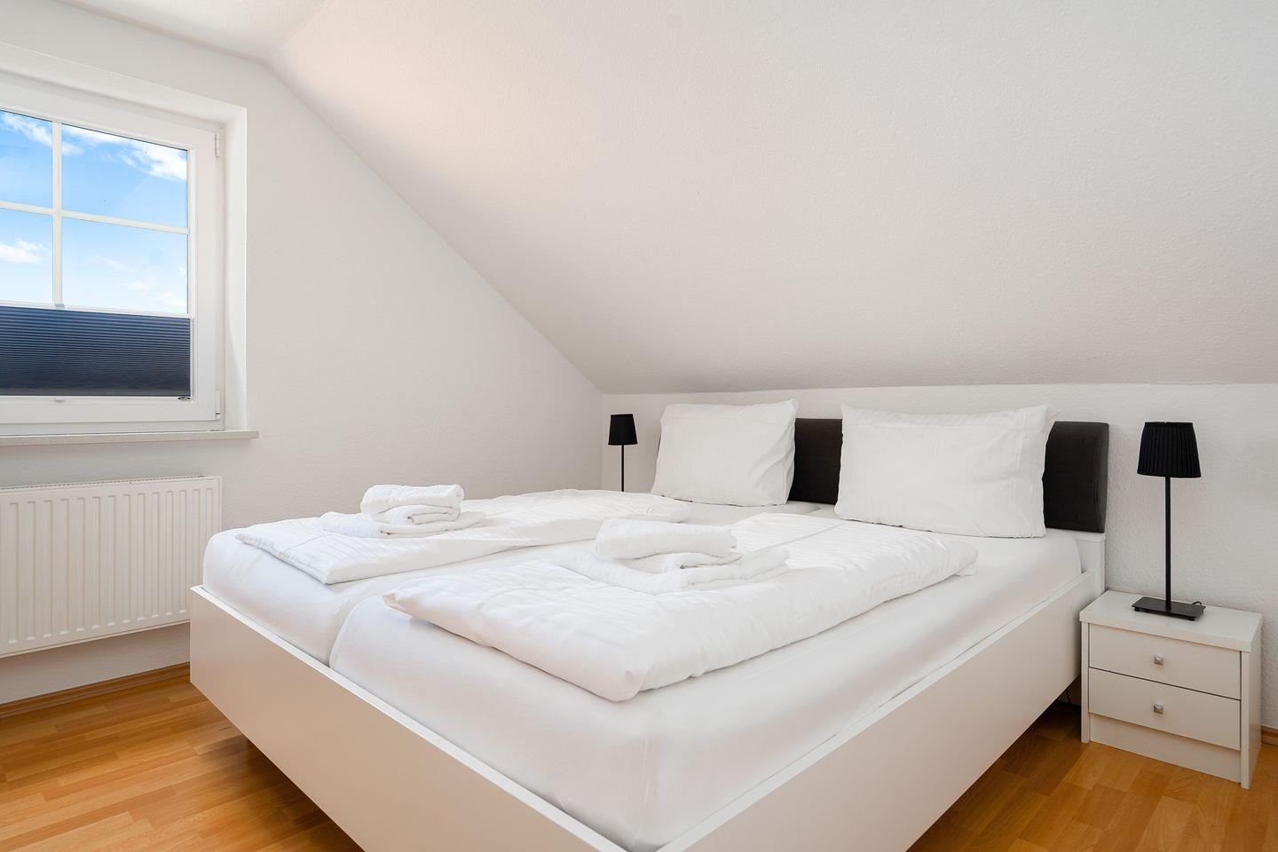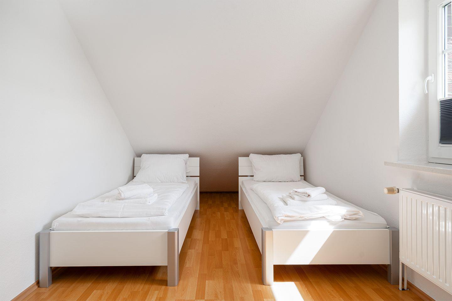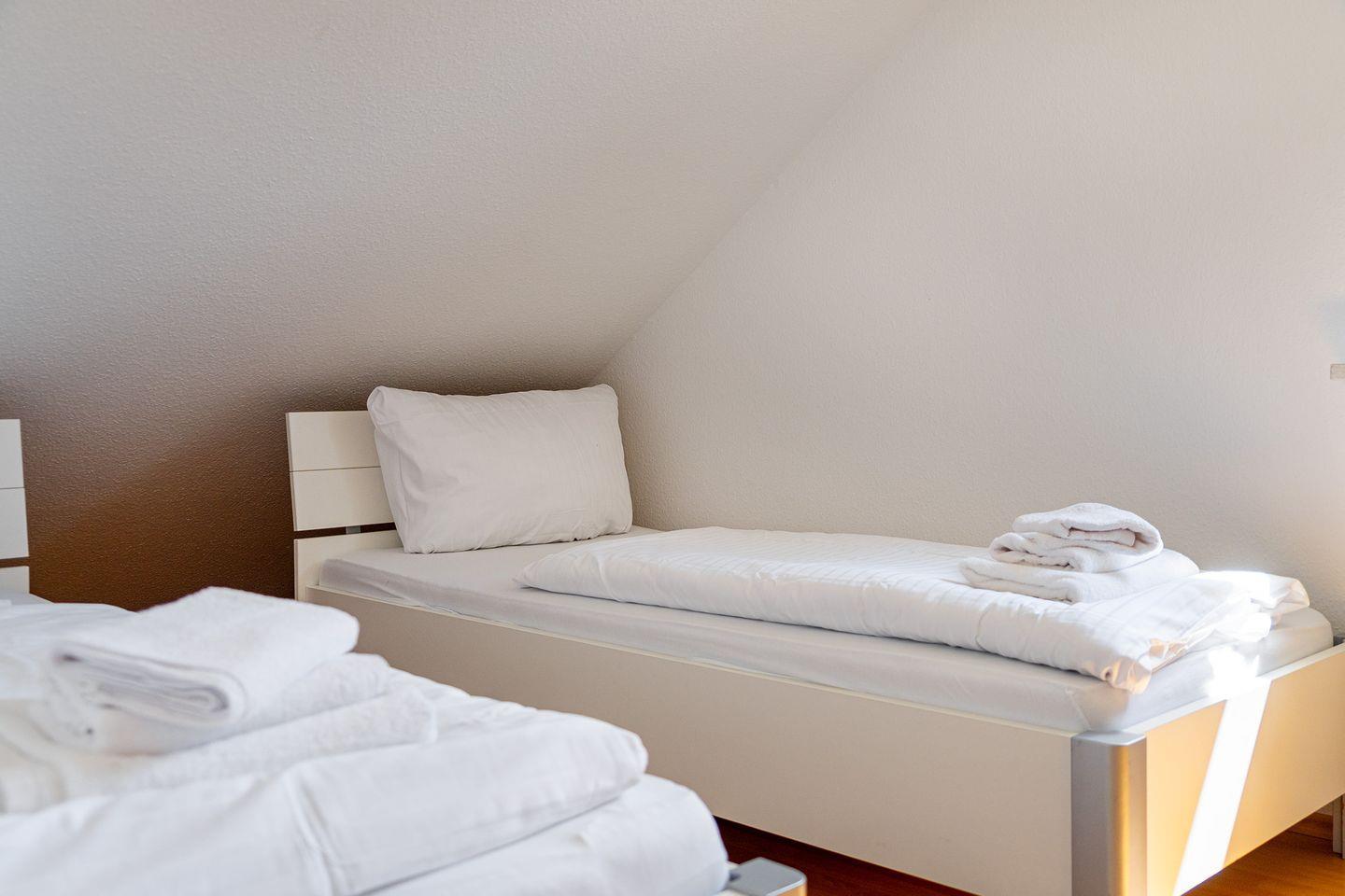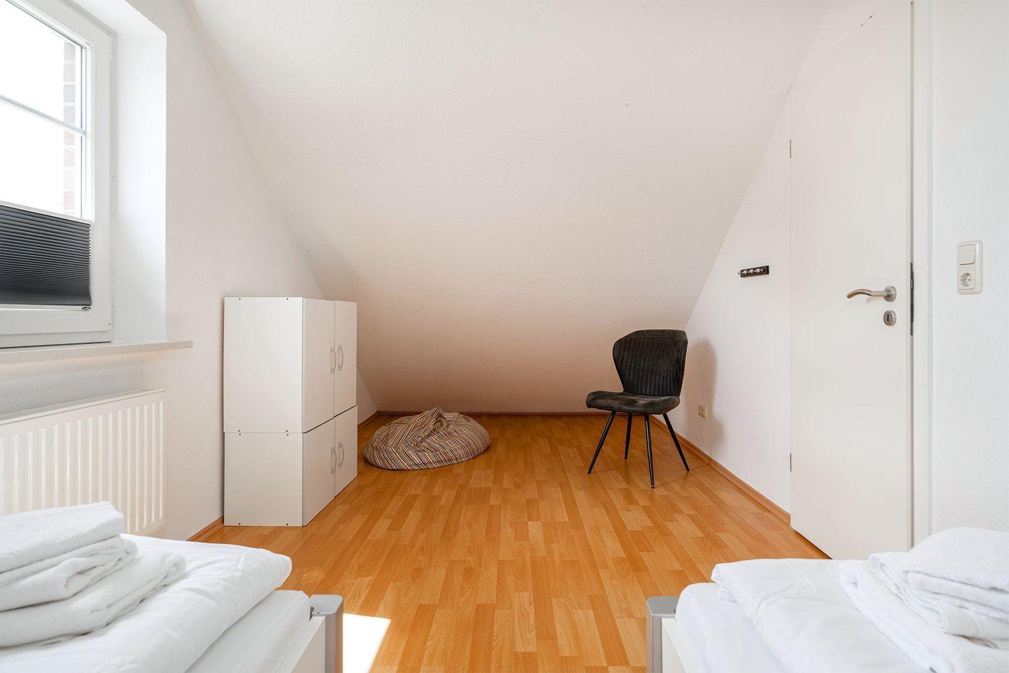 Das Obergeschoss (Laminat) ist ausgestattet mit 2 weiteren Schlafräumen (1 Doppelbett (neu in 2025) und 2 Einzelbetten) mit Kleiderschränken und einem 2. Duschbad.