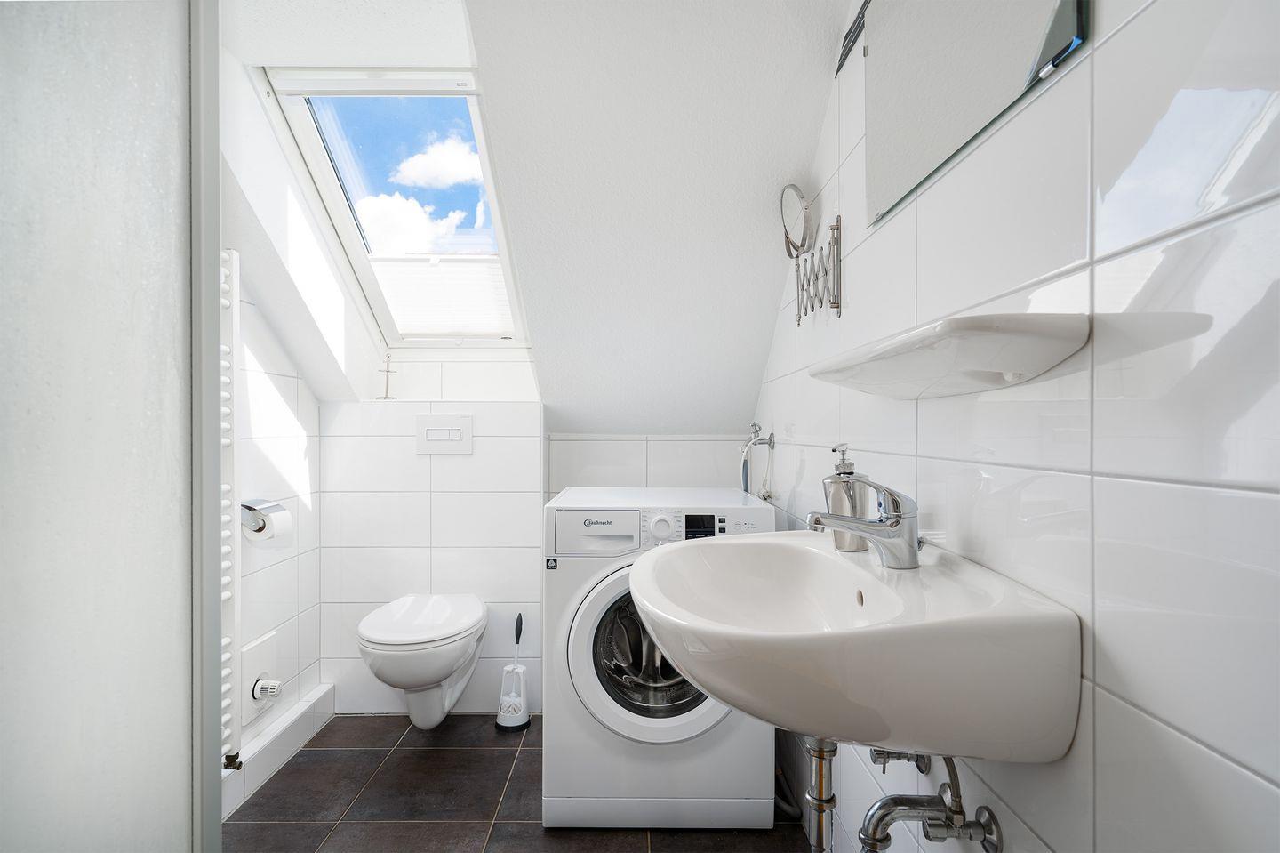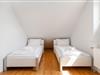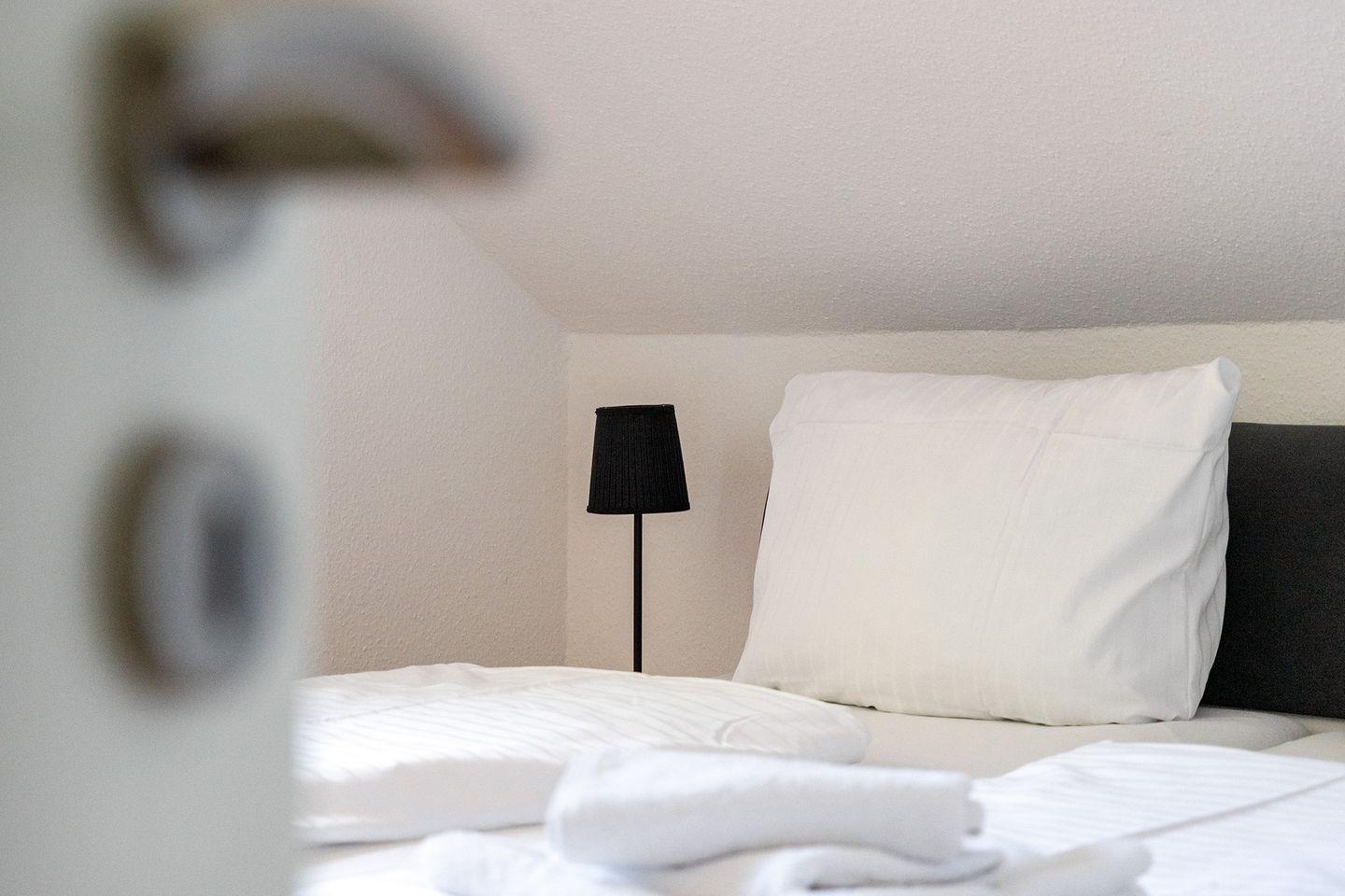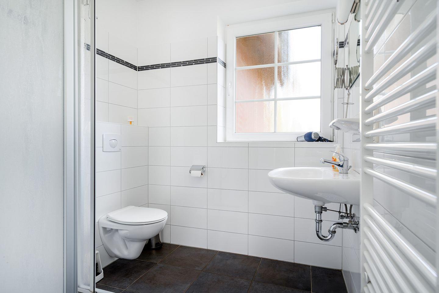 Das Obergeschoss (Laminat) ist ausgestattet mit 2 weiteren Schlafräumen (1 Doppelbett (neu in 2025) und 2 Einzelbetten) mit Kleiderschränken und einem 2. Duschbad.