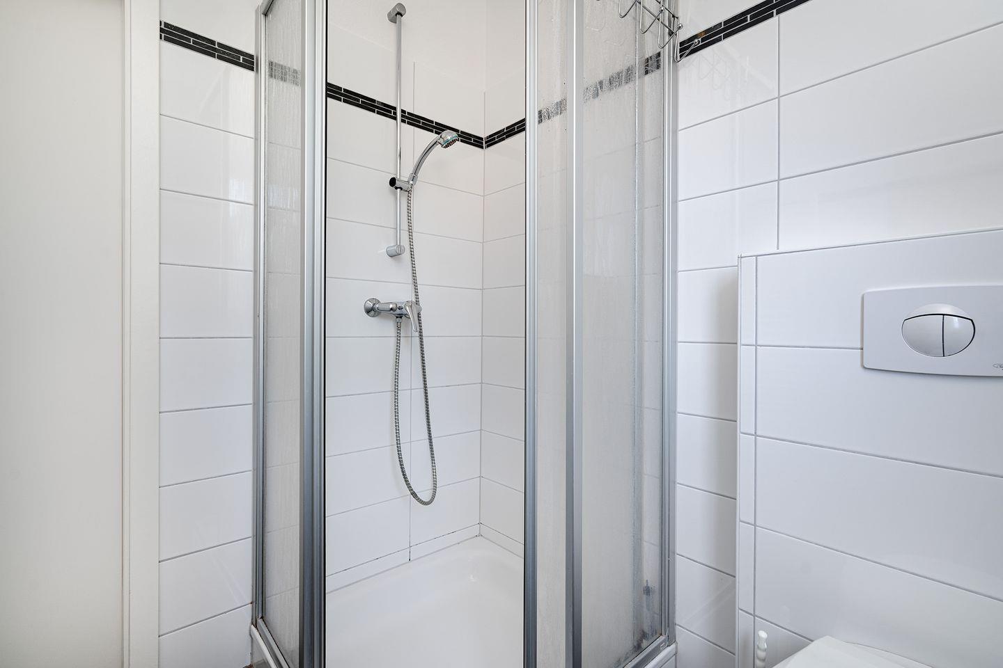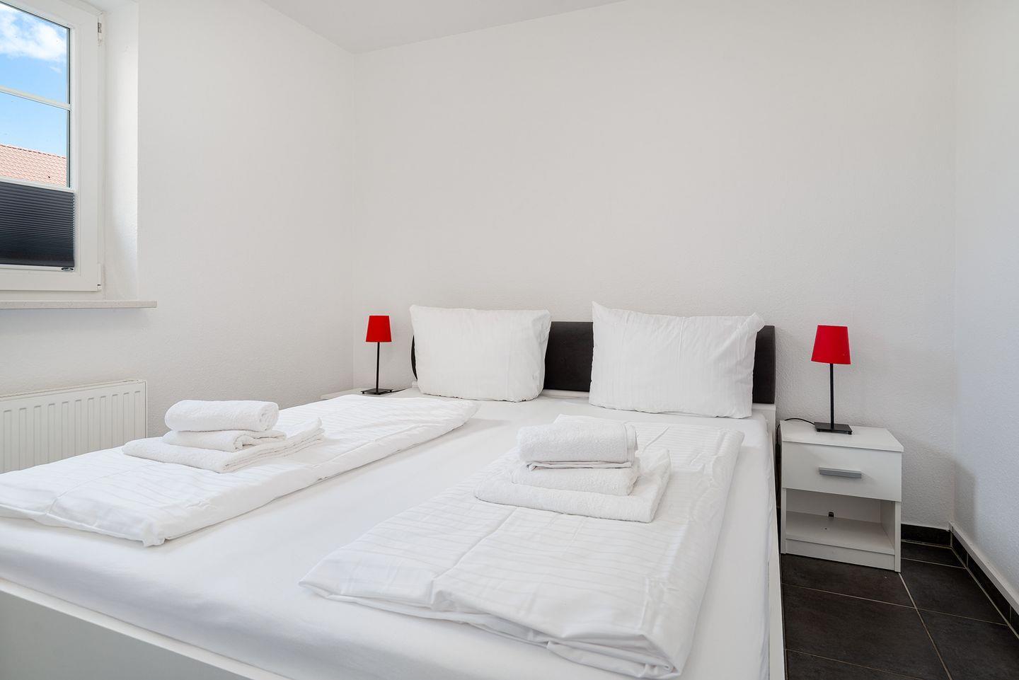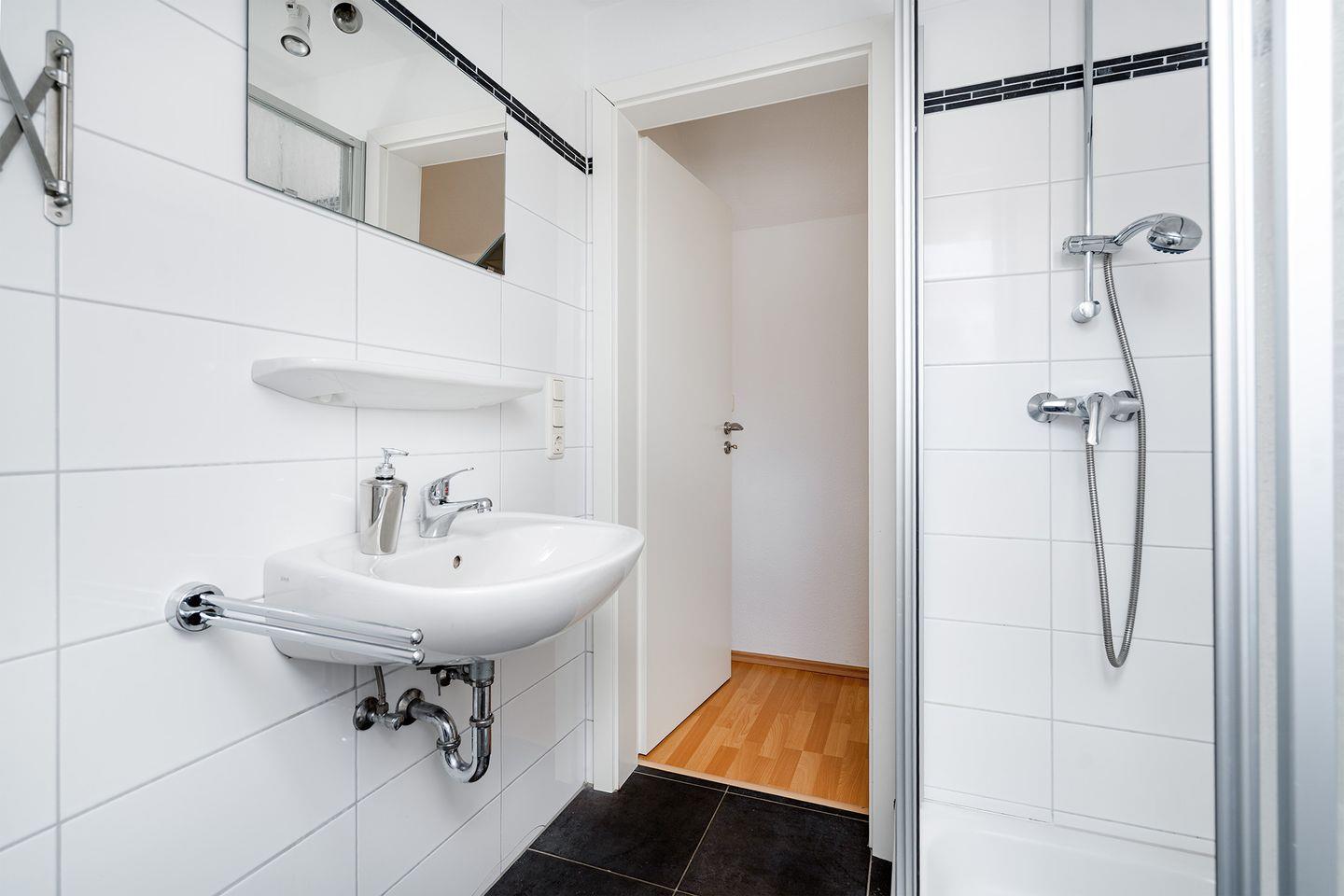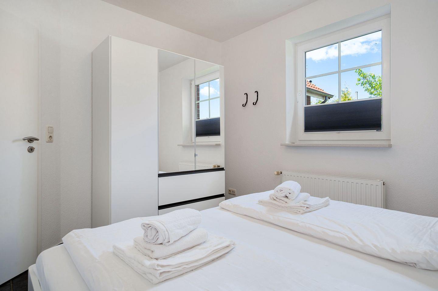 Ein Schlafraum mit einem Doppelbett und Kleiderschrank (komplett neu in 2025) und einem Duschbad befindet sich im EG.