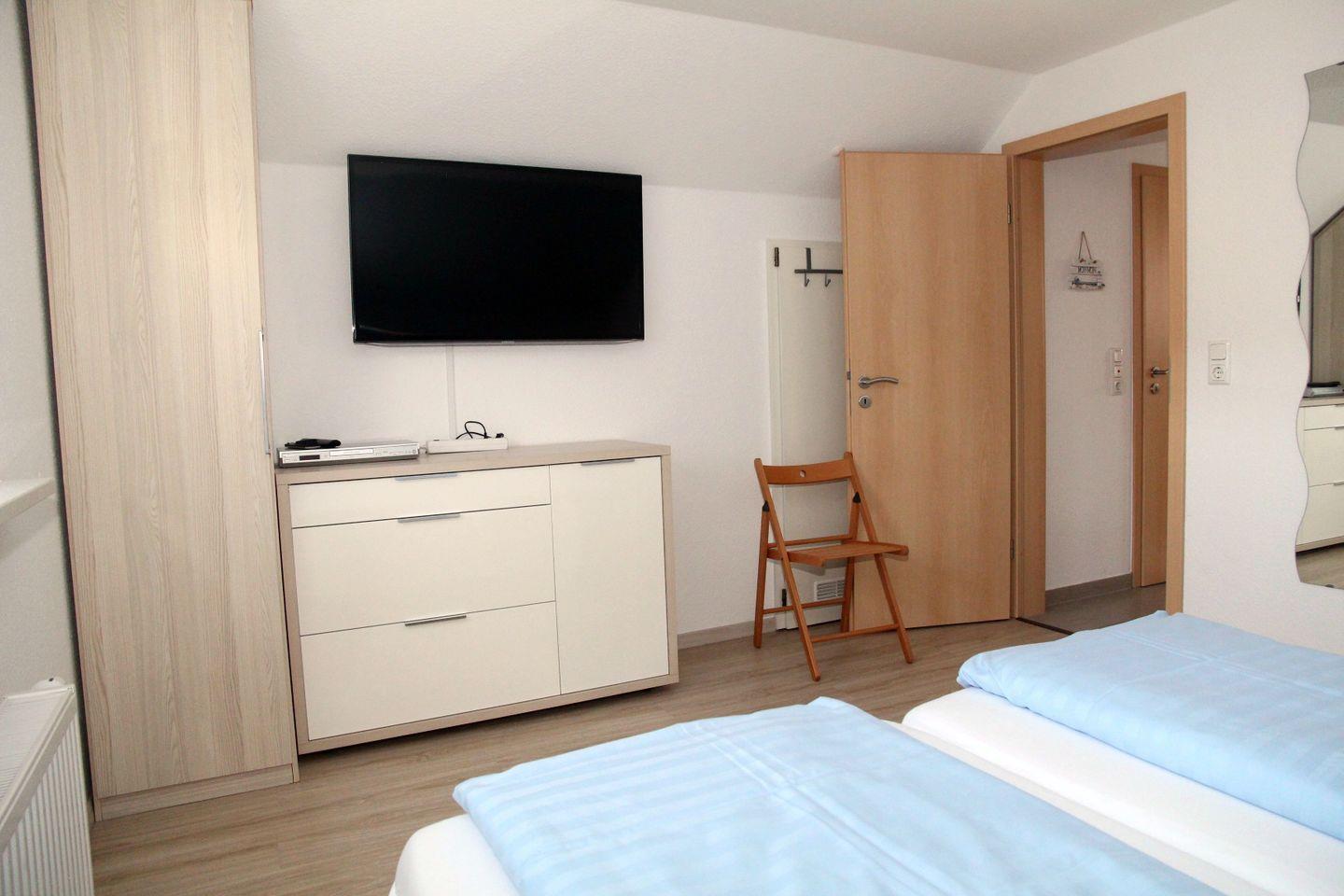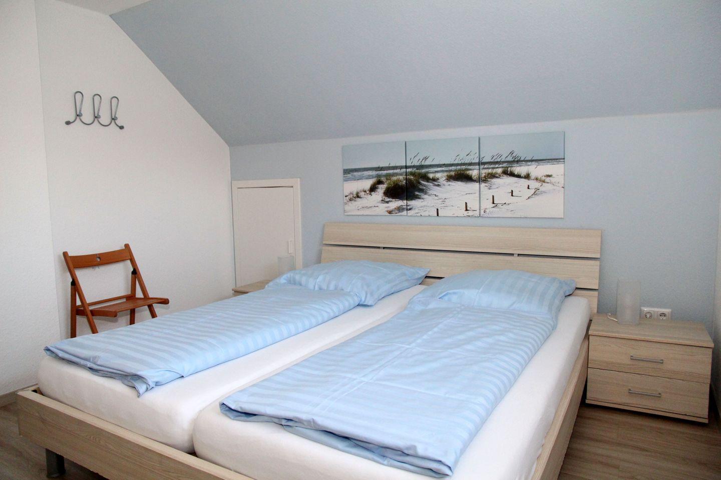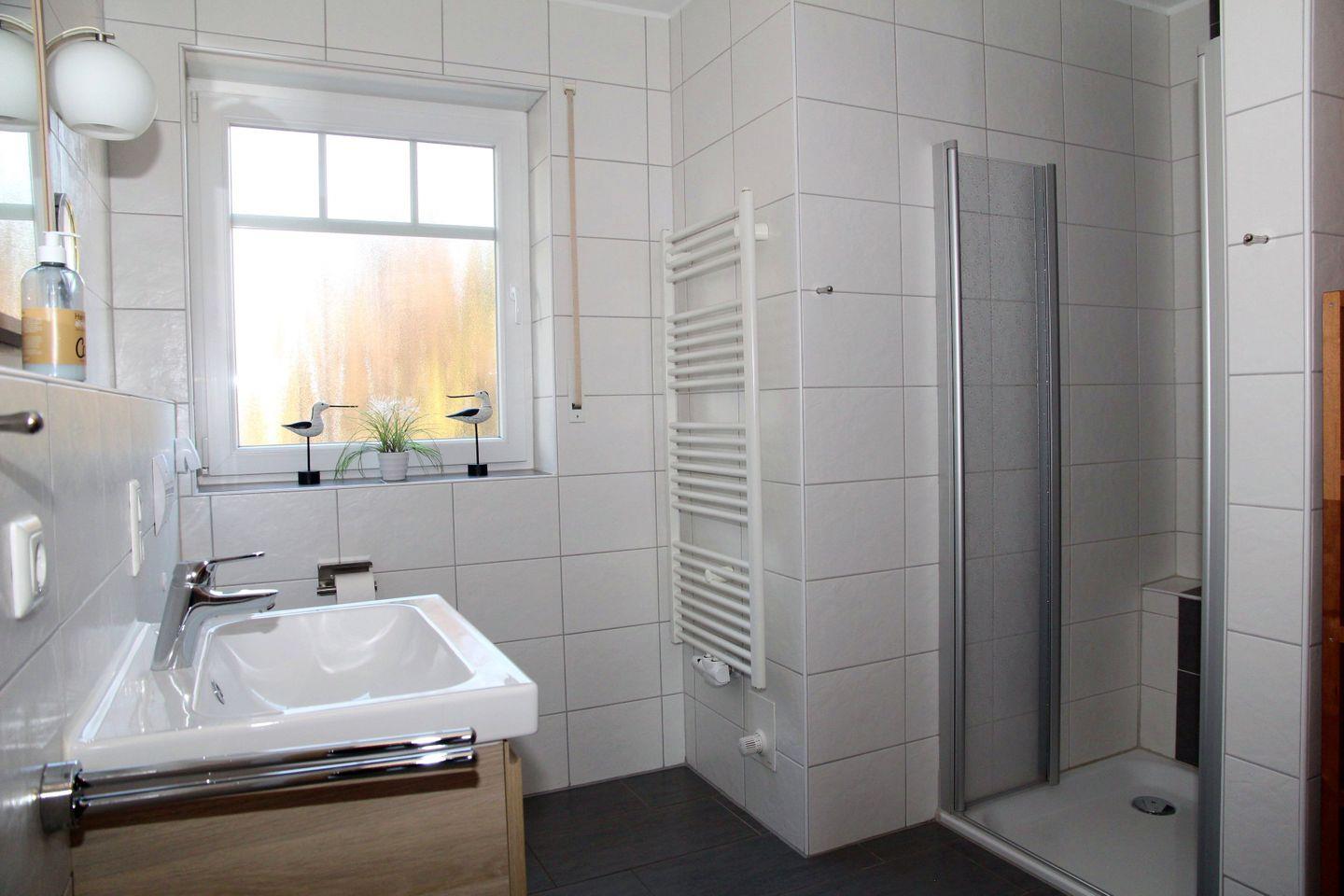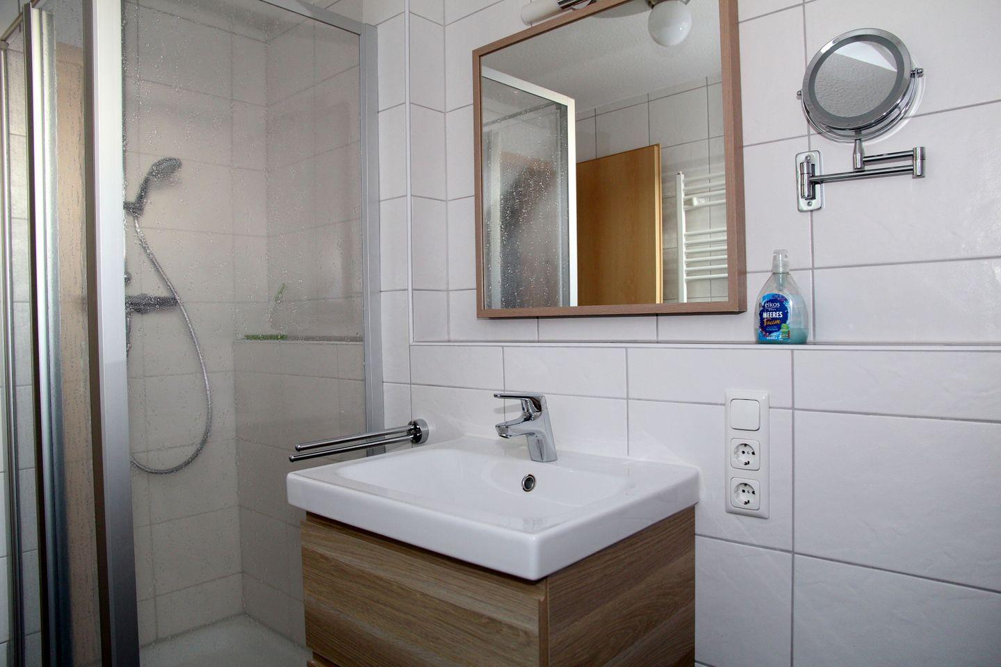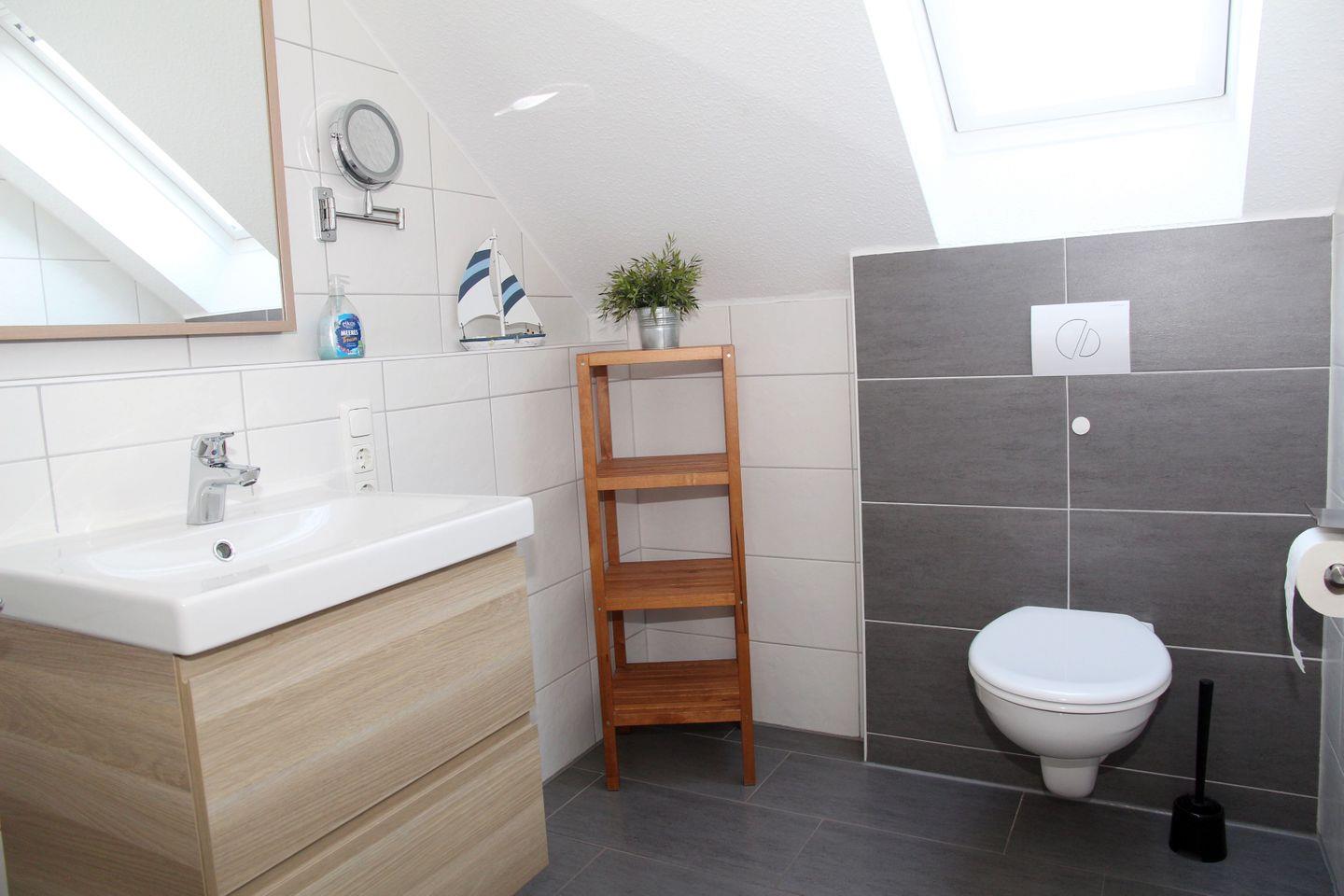 Im Obergeschoss gibt es ein zweites Duschbad, ebenfalls mit Fußbodenerwärmung, Dusche mit niedrigem Einstieg und Handtuchtrockner und 2 weitere Schlafzimmer (eins davon mit LCD-TV) mit hochwertigem Vinyl/Designboden ausgestattet. Für die kleinen Gäste gibt es kostenlos ein Kinderreisebett und einen Hochstuhl.