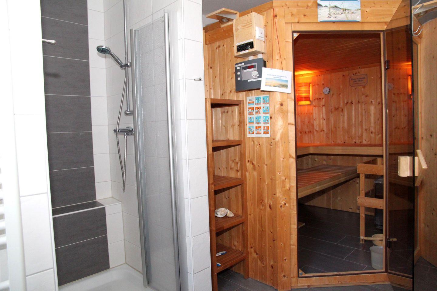 In der vollständig ausgestatteten Küche mit z. B. Geschirrspülmaschine, Mikrowelle, Backofen, großem Kühl- und Gefrierschrank, Kaffeemaschine, Kaffeepadmaschine, Toaster, Mixer, Eierkocher, Wasserkocher u.v.m. bleiben keine Wünsche offen. Selbstverständlich sind eine Waschmaschine und ein Trockner sowie Bügeleisen und Bügelbrett vorhanden. Auch ein Bad mit großer Sauna (Liegen gut 2m lang), Handtuchtrockner und Dusche mit niedrigem Einstieg befindet sich im EG.