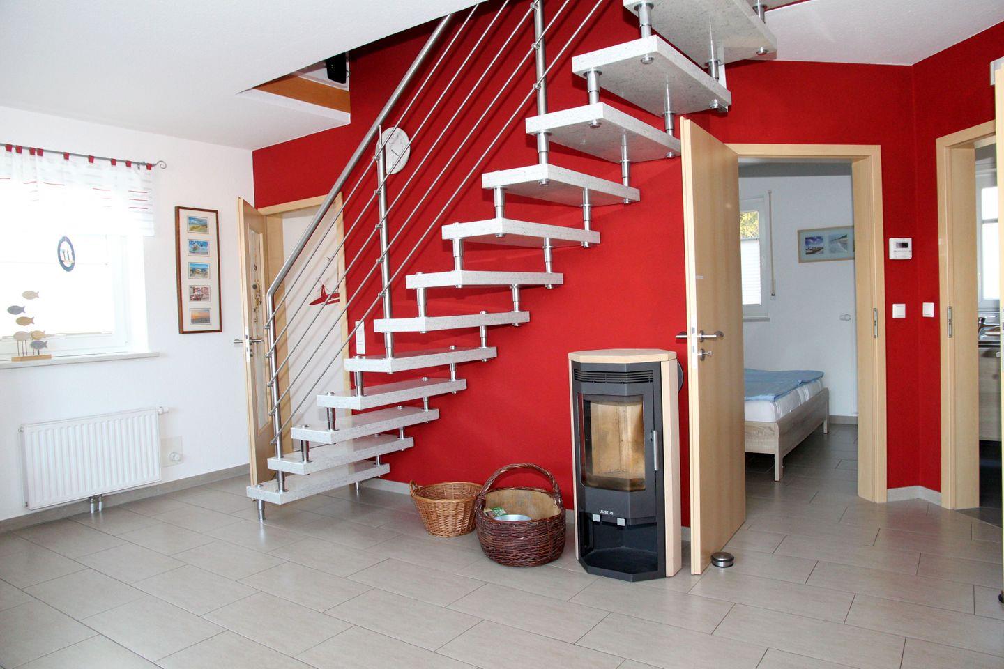 Das Erdgeschoss ist komplett gefliest und bis auf das Schlafzimmer mit Fußbodenerwärmung ausgestattet. Hier befinden sich ein Schlafzimmer mit Doppelbett sowie der große, offene Wohn-Essbereich mit gemütlichem Kaminofen für wohlige Wärme, großem LCD-TV, Blu-Ray-Player, Stereo-Anlage mit CD und USB/iPad/iPhone-Anschluss.