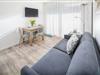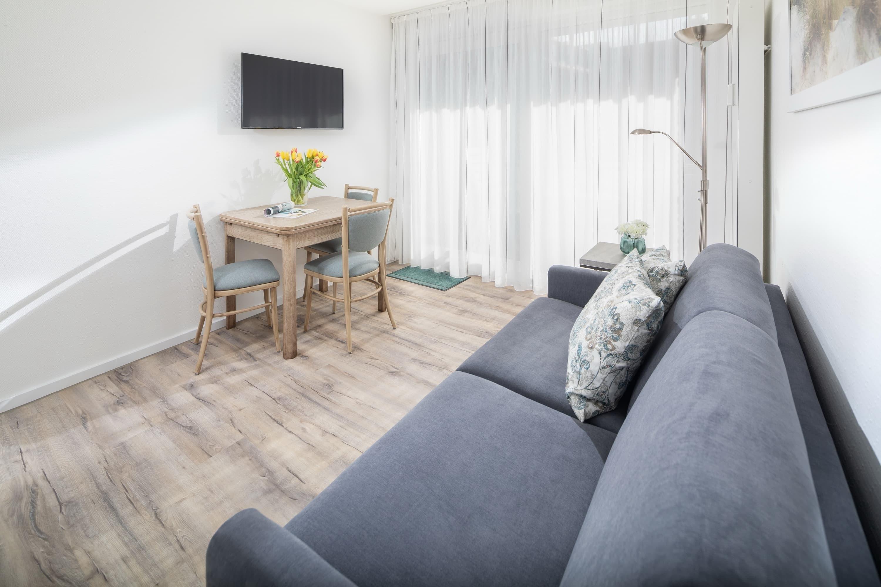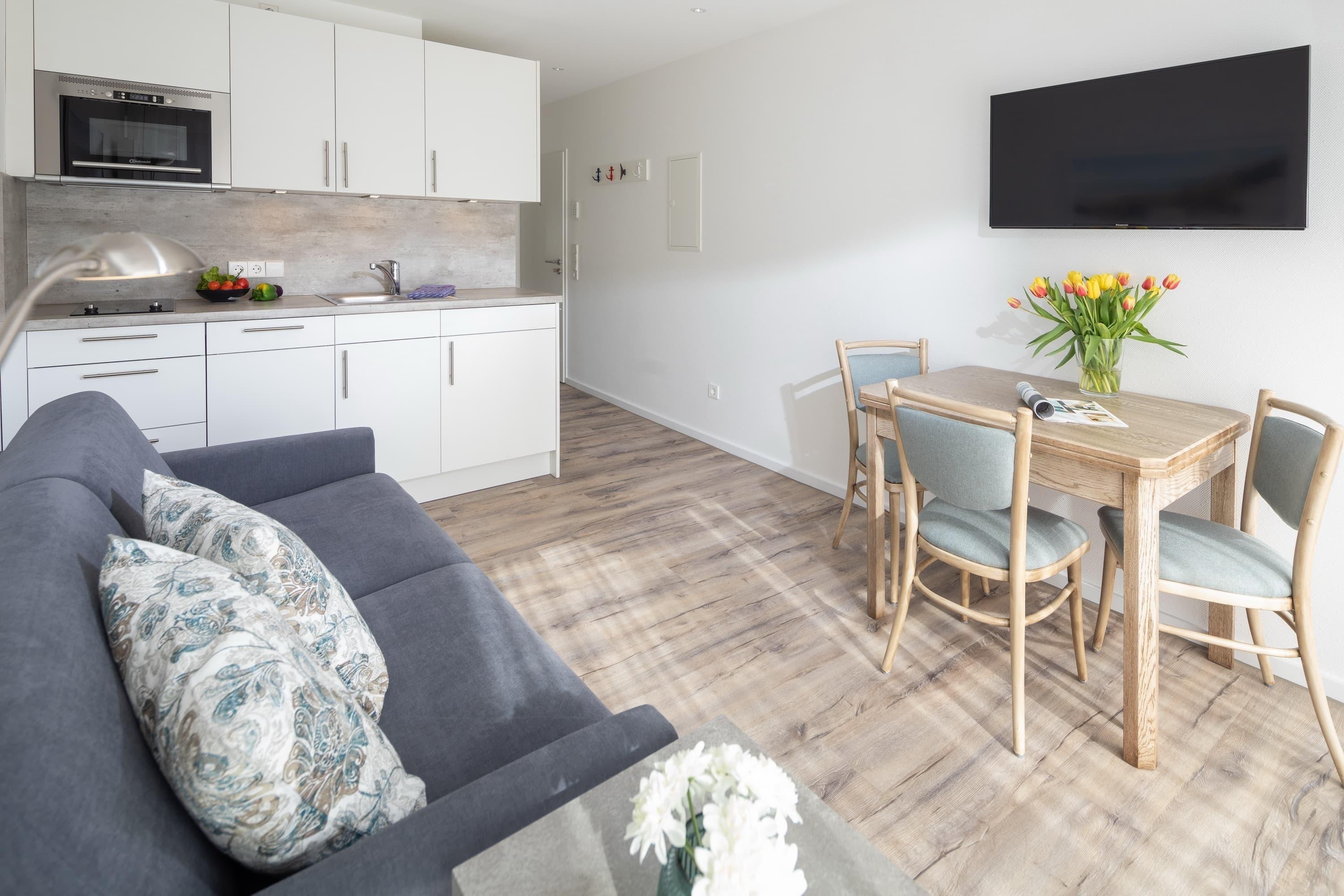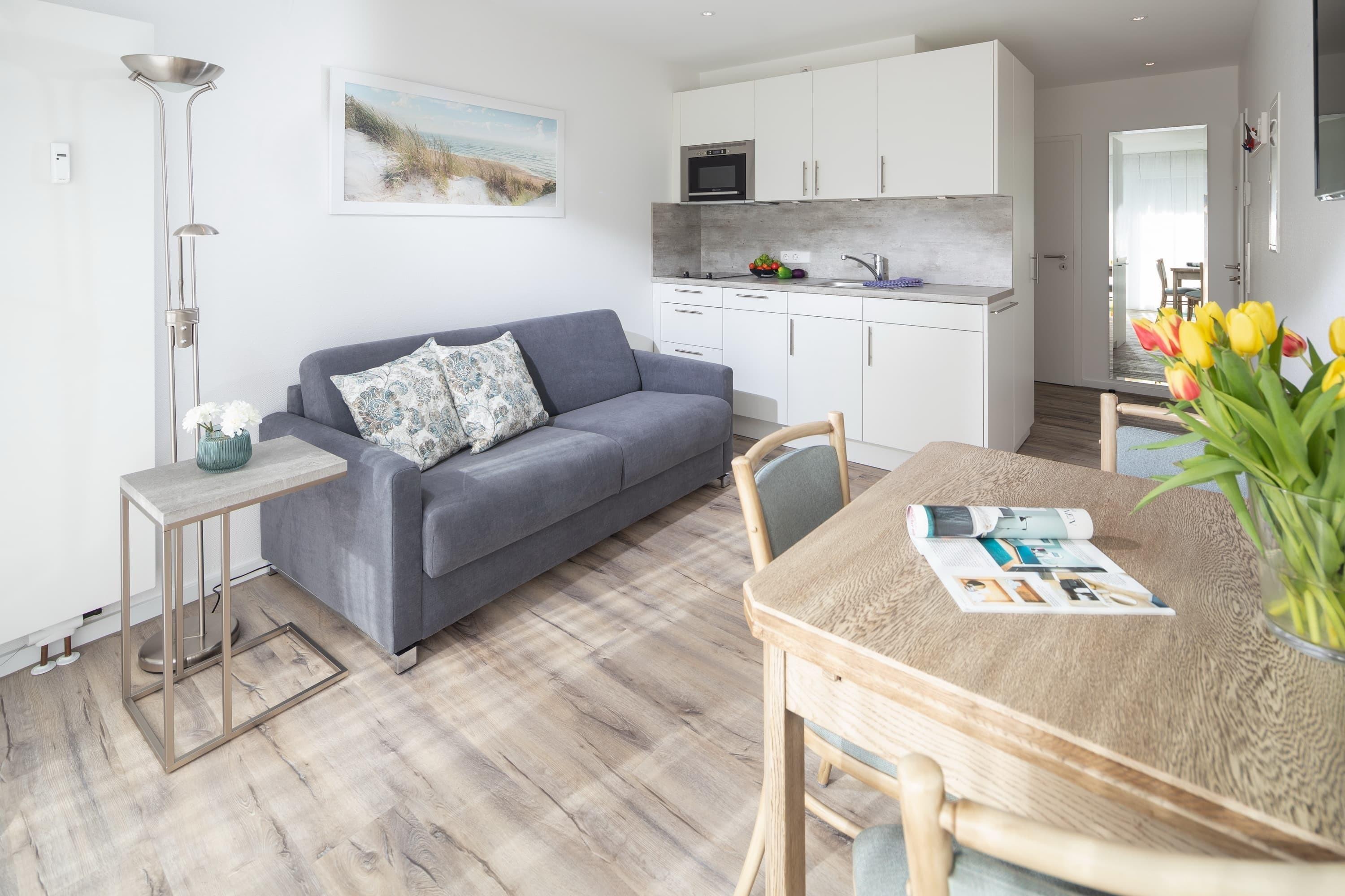 Moderne Ferienwohnung in Norderney mit Balkon, Küchenzeile und gemütlichem Ambiente, ideal für bis zu 3 Personen.