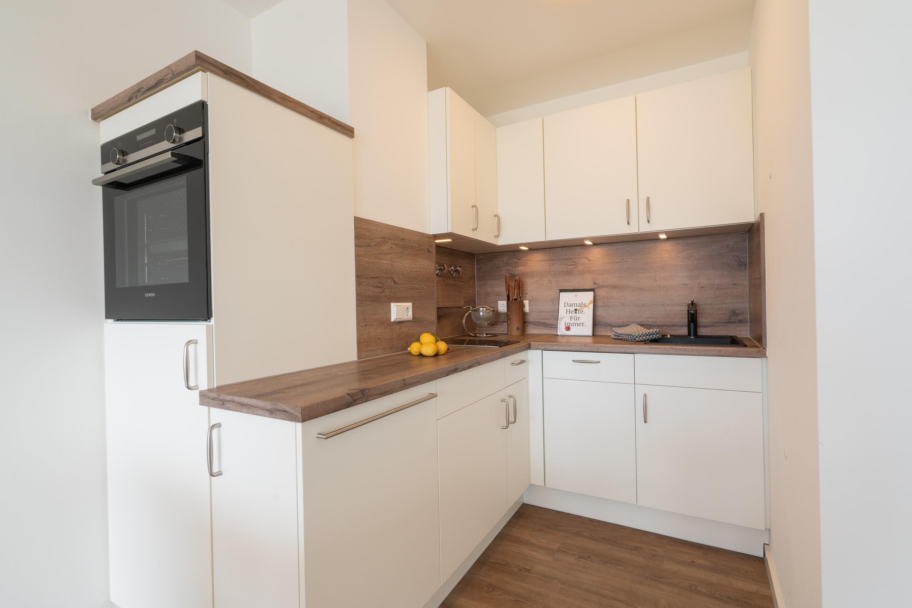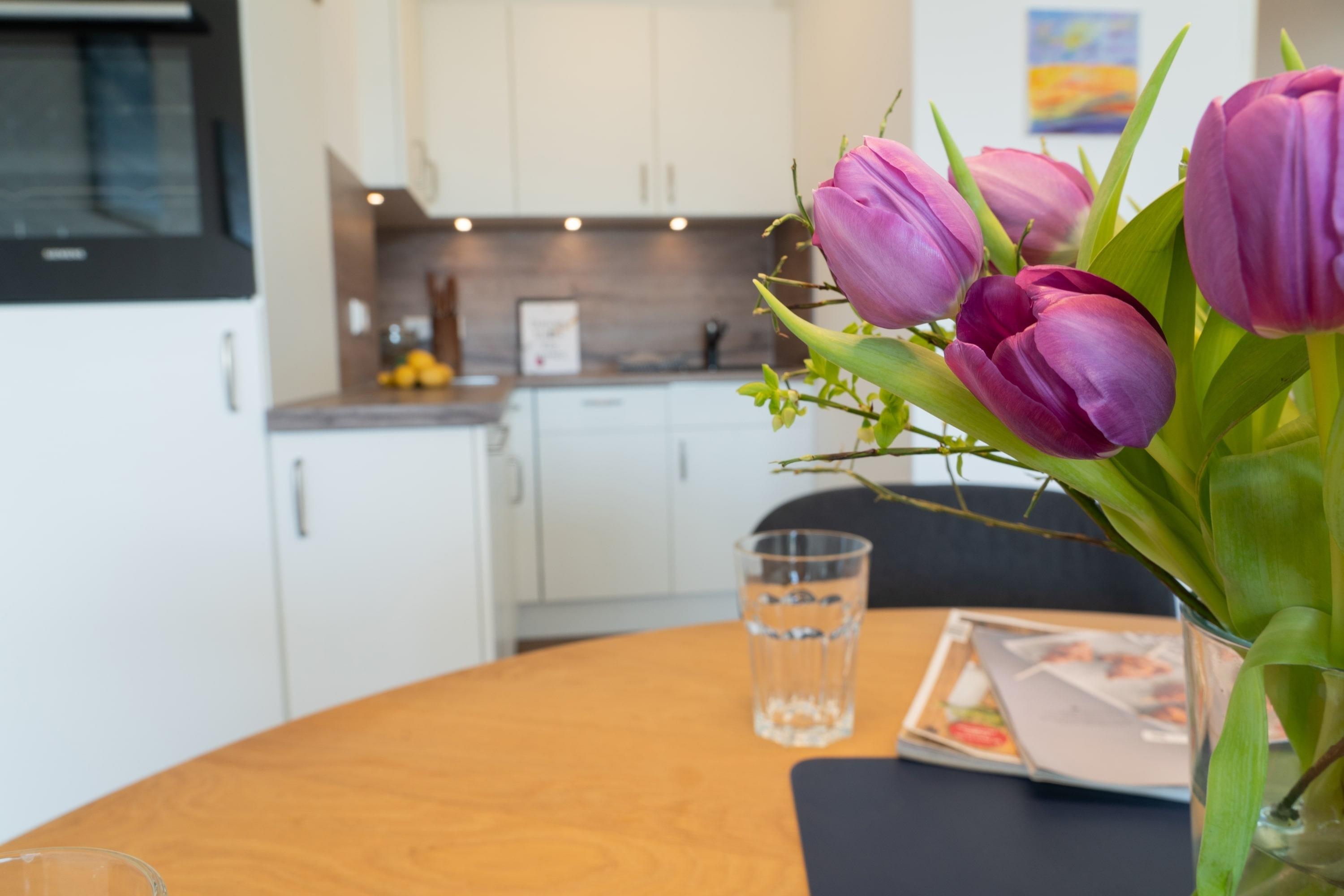 Der Wohnbereich mit offener Küche bietet einen Esstisch für gemeinsame Mahlzeiten, die in der perfekt