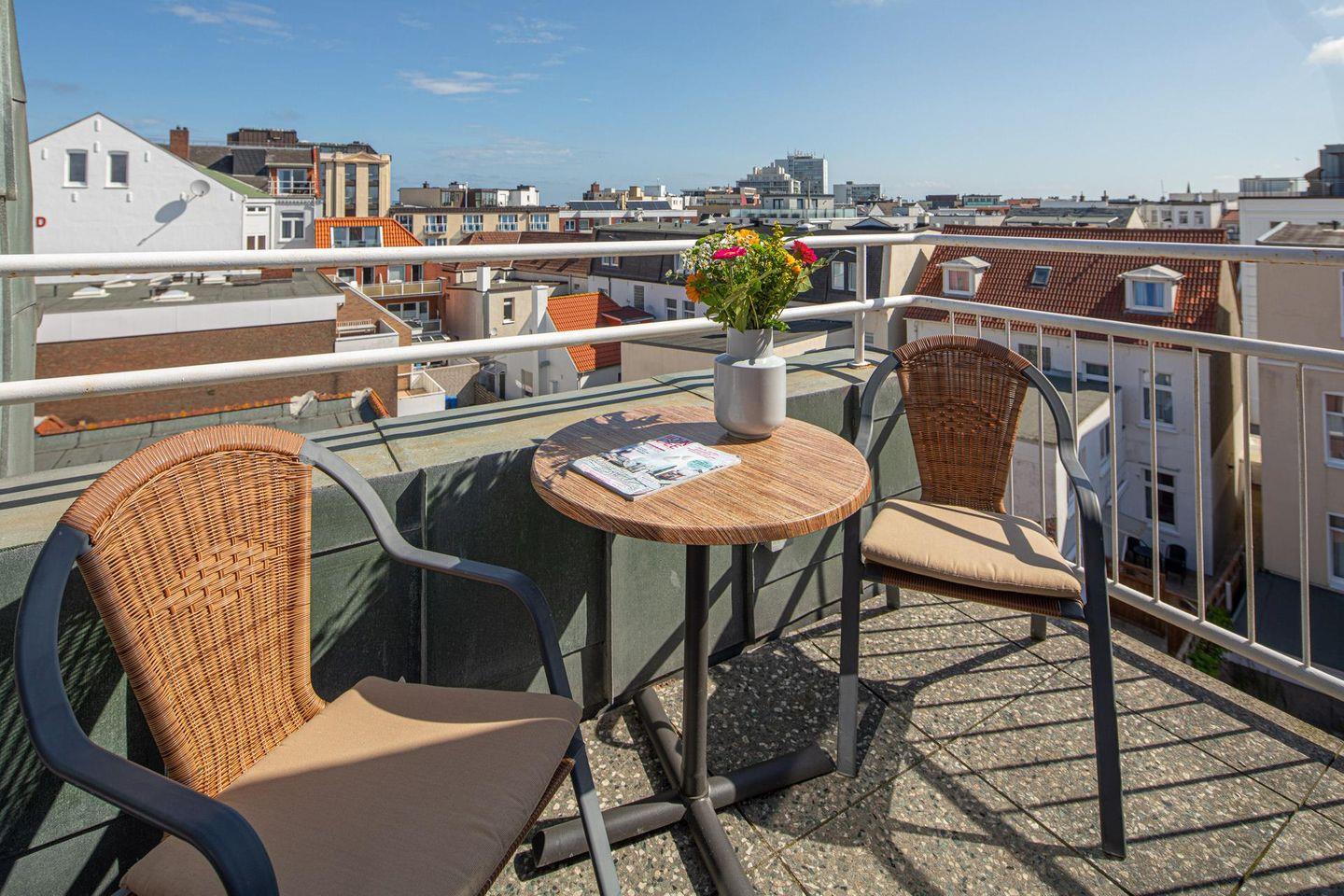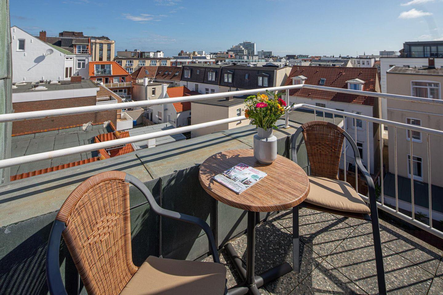 Genießen Sie den historischen Charme und die Dachterrasse der Ferienwohnung Inselhus 10 auf Norderney, nur 110 m vom Strand entfernt.