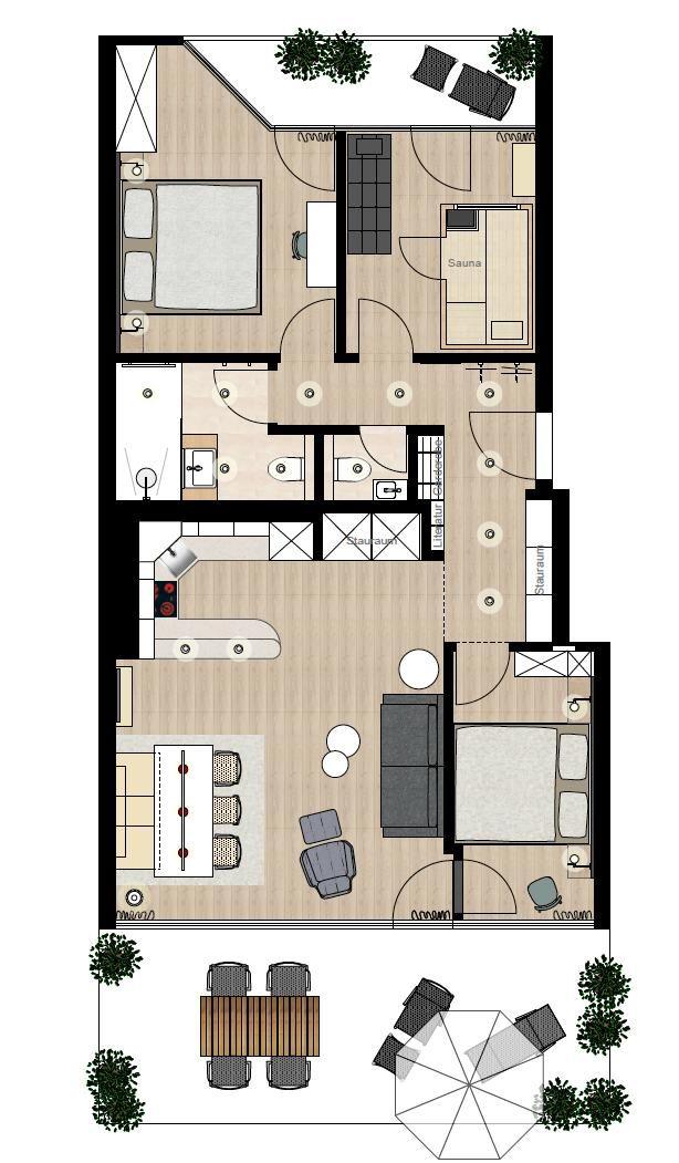 Die Wohnung verfügt über 2 Schlafzimmer mit Boxspringbetten. Ein Doppelbett bietet ihnen eine komfortable Länge von 2,10m. Aus dem anderen 2m langen Doppelbett kann man direkt aufs Meer blicken. Bei Bedarf ist auch ein ausklappbares Schlafsofa im Wohnzimmer nutzbar. Die Wohnung verfügt über insgesamt 3 TV-Geräte, WLAN, Fußbodenheizung und - als besonderes Highlight - einen eigenen Saunabereich. Das moderne Badezimmer wurde mit einer geräumigen Regendusche mit Glasabtrennung ausgestattet. Ein zweites WC befindet sich in einem separaten Raum direkt nebenan. Die offene Küche entspricht nicht nur technisch, sondern auch optisch höchsten Ansprüchen (Mikrowelle mit Grill und Crisp Funktion) und ist in den Wohn-Essbereich integriert. Die Wohnung verfügt über zwei Dachterrassen, eine mit direktem Meerblick und einem Strandkorb ausgestattet, die andere nach Süden ausgerichtet.