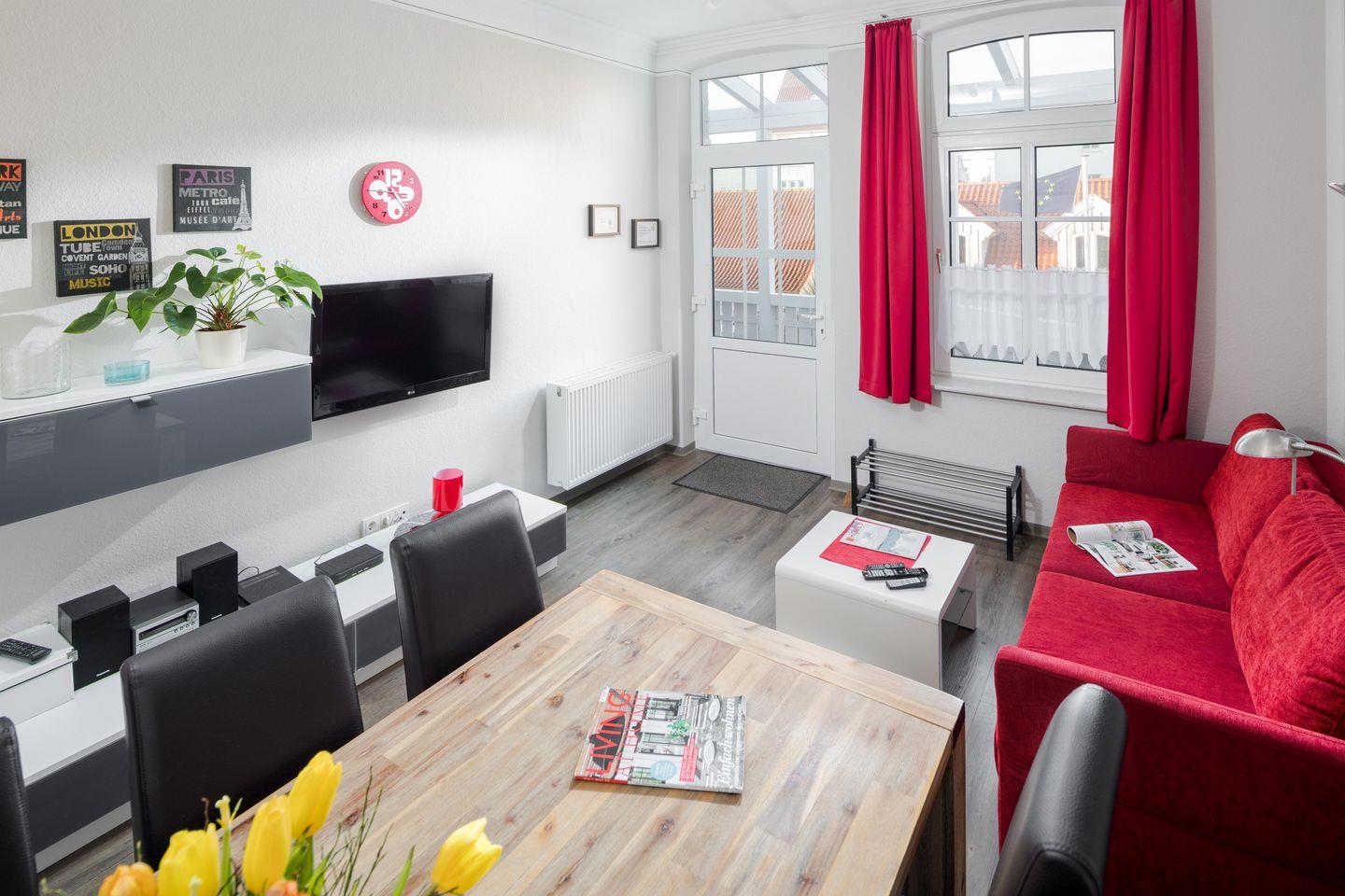 Die Wohnung befindet sich im Obergeschoss des Hauses und bietet mit ihren 55 Quadratmetern ausreichend Platz für bis zu vier Personen. Die Ferienwohnung "Villa Stefanie 2" ist über eine steile Wendeltreppe erreichbar und verfügt über einen separaten Eingang sowie einen überdachten Balkon. Sie verfügt über zwei separate Schlafzimmer. Im ersten Schlafzimmer befindet sich ein Doppelbett, während das zweite Schlafzimmer mit zwei Einzelbetten ausgestattet ist. Die Küche ist vollständig eingerichtet. Unter anderem gibt es einen 4-Plattenherd, einen Backofen, einen Kühlschrank, eine Geschirrspülmaschine, einen Gefrierschrank, eine Mikrowelle, einen Toaster, eine Kaffeemaschine sowie Töpfe, Pfannen und Geschirr. Im Wohnzimmer steht zudem ein LCD-Fernseher zur Verfügung. Hier darf auch der vierbeinige Freund mitkommen. Erlaubt ist maximal 1 Hund (Höhe maximal kniehoch). Die Hundewiese befindet sich in der Nähe des Weststrandes (kein Leinenzwang).