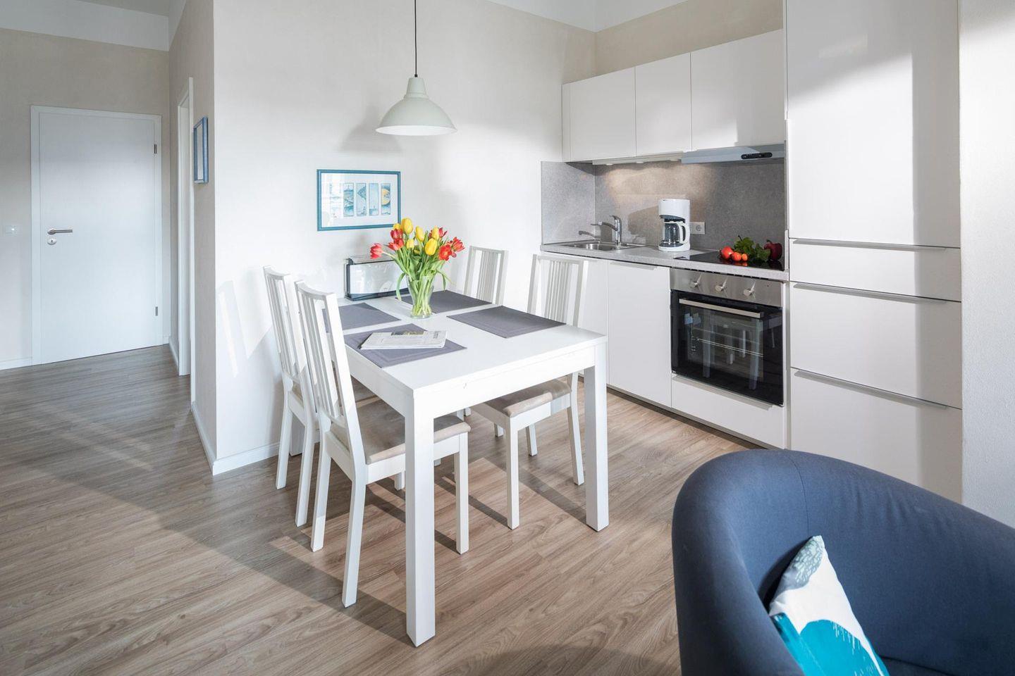 Die Wohnung wurde modern und hell eingerichtet. Es wurde Wert auf natürliche Farben gelegt. Die Wohnung verfügt über ein Schlafzimmer mit einem Doppelbett und eine Ausziehcouch im Wohnzimmer, die Platz für eine dritte Person oder getrenntes Schlafen bietet. Das Badezimmer wurde mit einer flachen Dusche und einem Handtuchtrockner ausgestattet. Im Haus "Jürgens" stehen eine Waschmaschine und ein Trockner (gemeinschaftliche Nutzung gegen Münzeinwurf) zur Verfügung. Fahrräder können im Hof abgestellt werden. Hunde sind in dieser Wohnung nicht erlaubt.