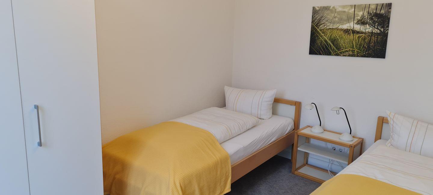 Schlafzimmer mit zwei Einzelbetten und Dusche/WC sind vorhanden. Ein Parkplatz kann bei Verfügbarkeit für 2,50 € pro Tag hinzugemietet werden. WLAN.