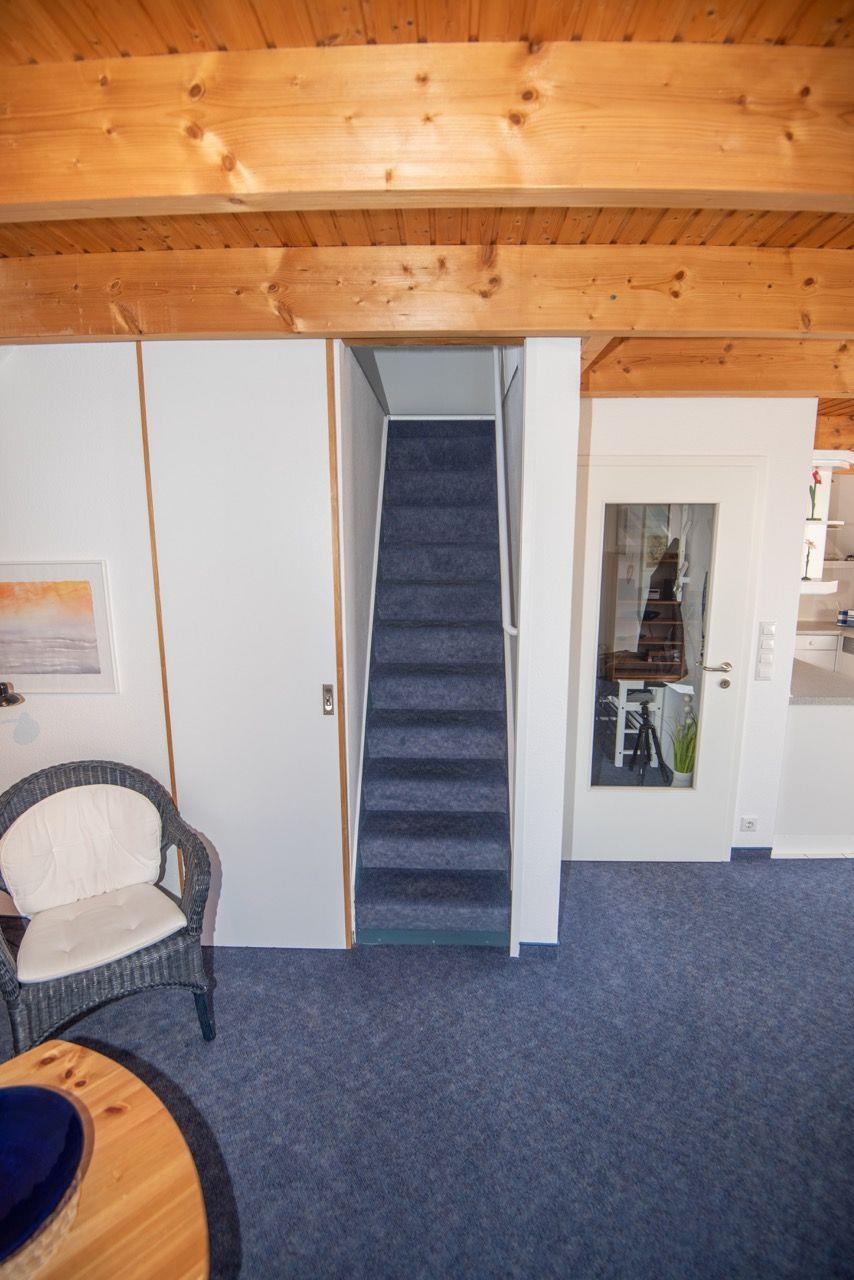 Diese gemütliche und moderne Ferienwohnung im 2. OG verfügt über einen großzügigen Wohnraum mit Schlafcouch (150x190cm) und einer integrierten Küche. Das Schlafzimmer im Spitzboden (mit Dachschrägen und über eine Treppe zu erreichen) ist mit einem Doppelbett (160 cm x 200 cm) ausgestattet. Auf dem Balkon kann man wunderbar frühstücken oder zu Abend essen.