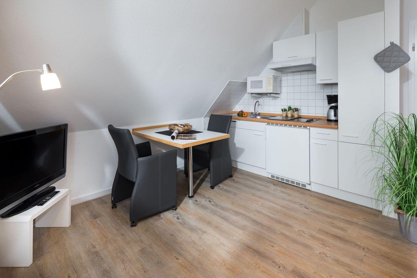 Gemütliche 1-Zimmer-Wohnung auf Norderney mit moderner Küche und Gemeinschaftsterrasse.