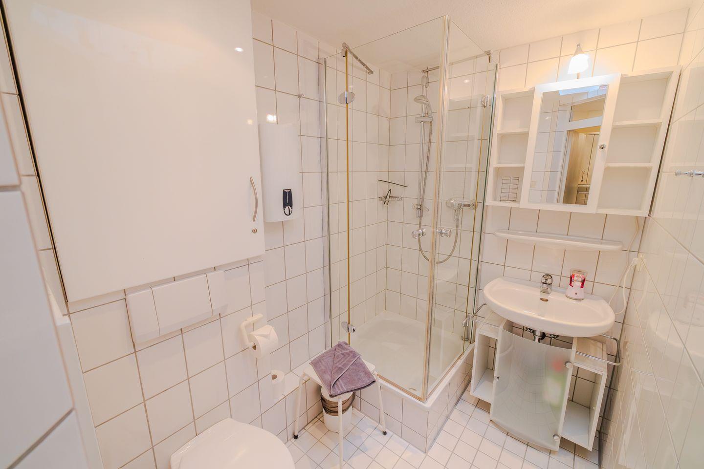 Das Badezimmer umfasst eine Dusche mit Wanne, ein WC, ein Waschbecken sowie einen Spiegel und einen Haartrockner. Für Ihre Sicherheit ist ein Rauchmelder installiert, und es steht ein Staubsauger für die Hausreinigung bereit. Sichtschutz an allen Fenstern gewährleistet ein angenehmes Maß an Privatsphäre.