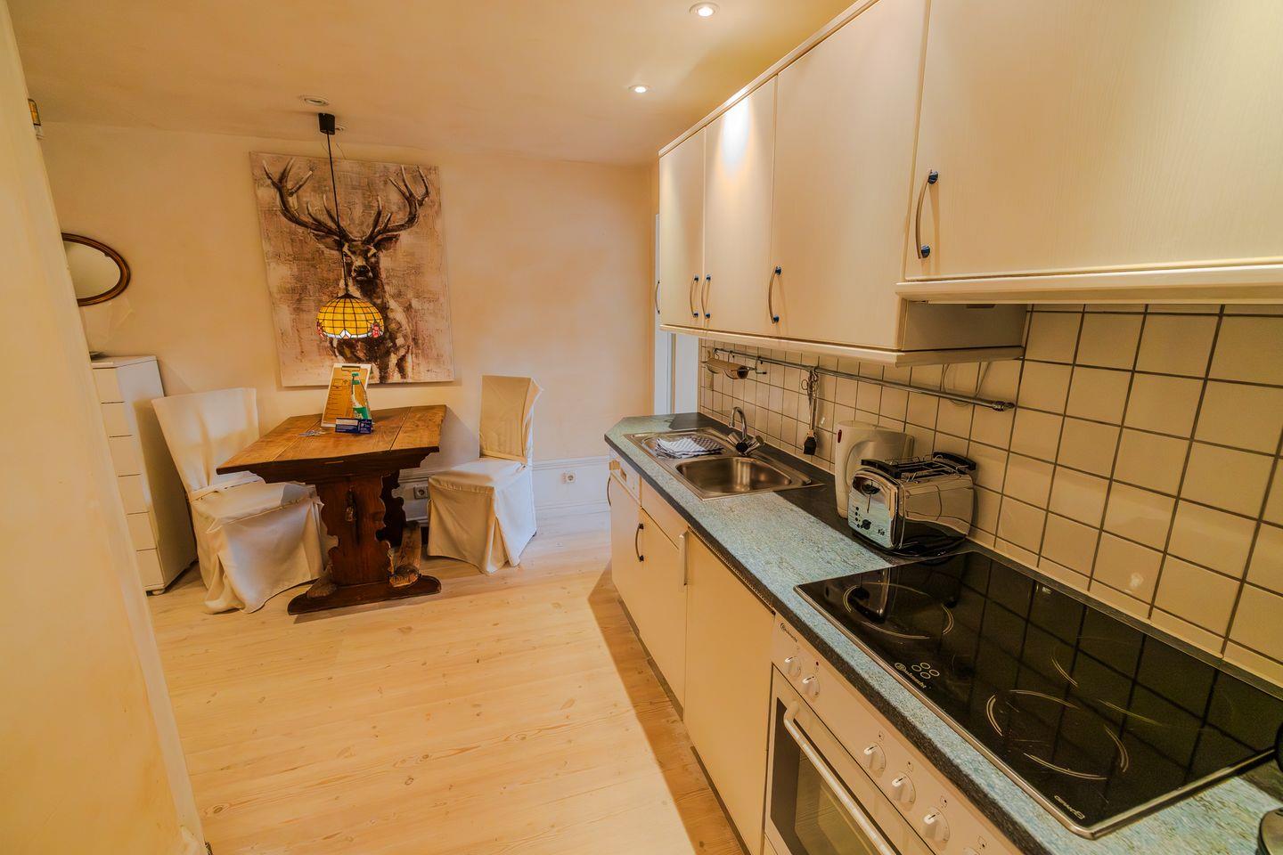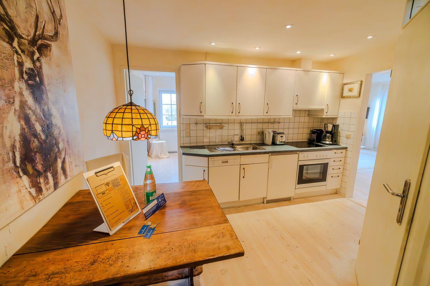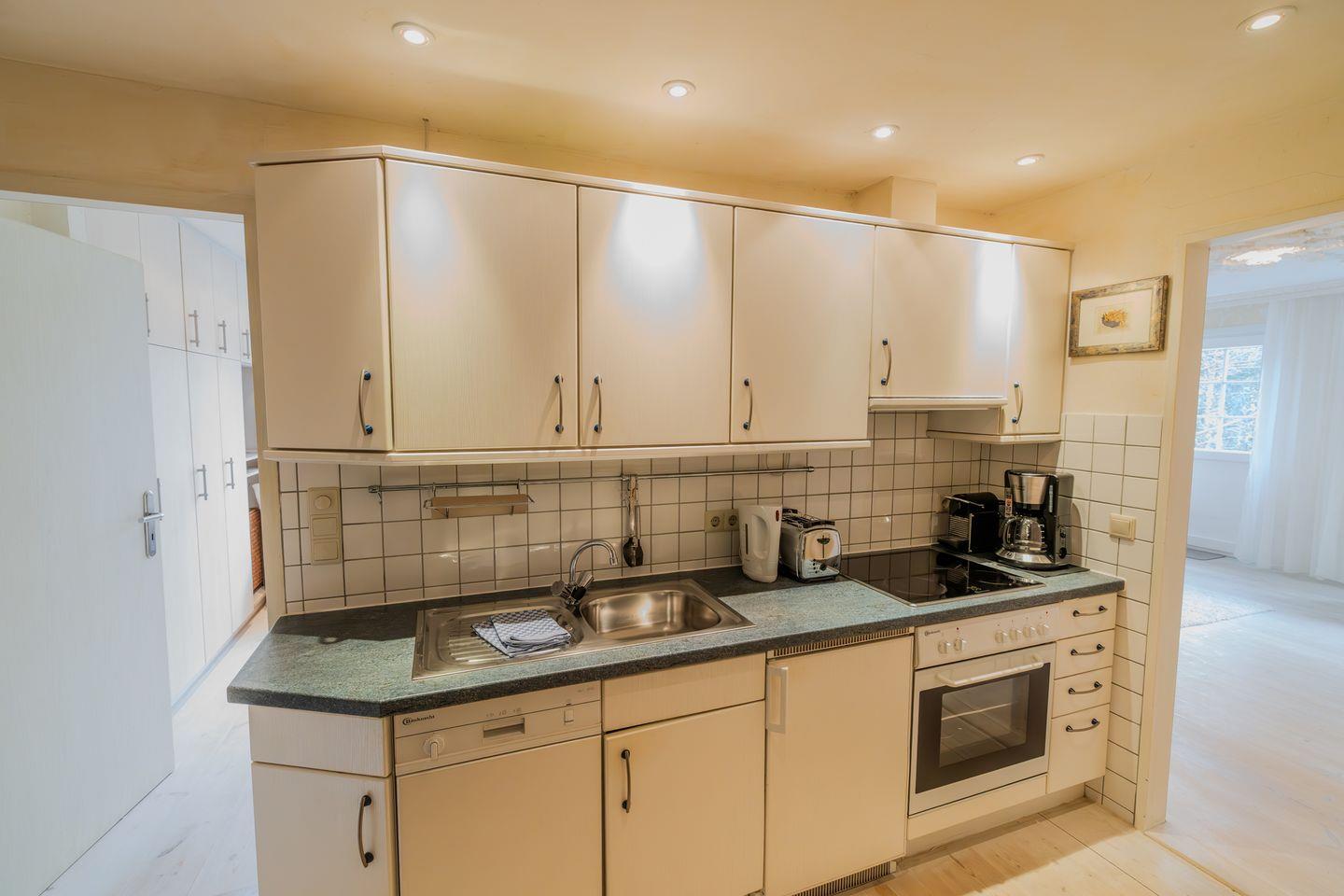 Die Küche ist geschlossen und modern ausgestattet. Hier finden Sie alle notwendigen Küchenutensilien, einen Ceran-Herd, Backofen mit Elektroanschluss, Kühlschrank mit separatem Gefrierfach, Mikrowelle, Toaster, Kaffeemaschine sowie eine Nespresso-Espressomaschine. Geschirr, Besteck und Geschirrhandtücher sind ebenfalls vorhanden. Ein Essbereich mit einem Esstisch schafft einen einladenden Rahmen für Mahlzeiten. Das Angebot wird durch eine Geschirrspülmaschine ergänzt, die den Abwasch erleichtert.
