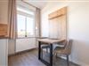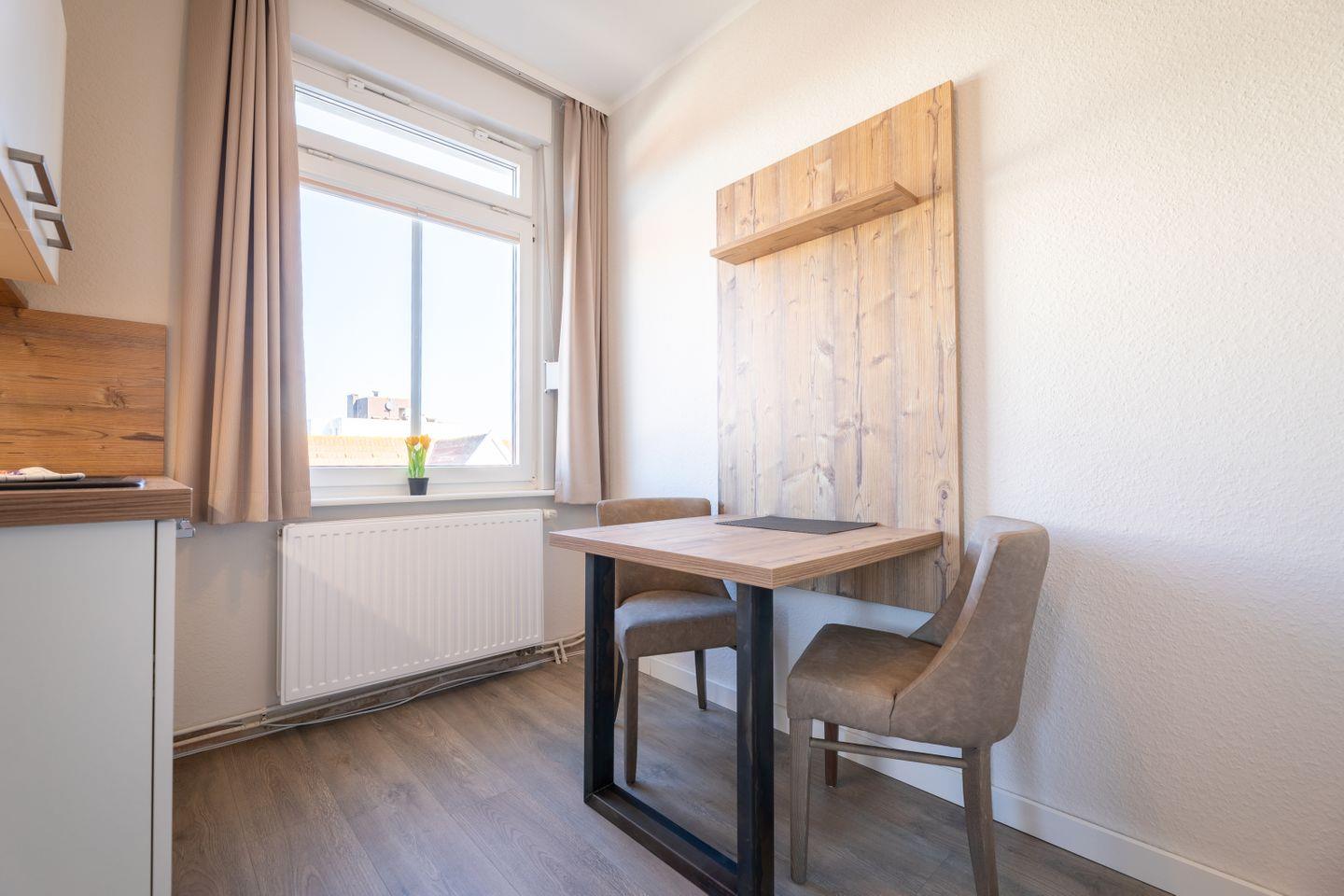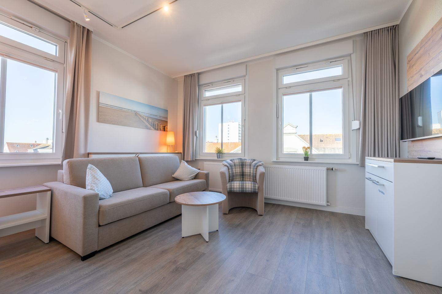 Moderne, helle Einraumwohnung auf Norderney mit maritimem Stil, gut ausgestatteter Küche und gemütlicher Sitzecke für erholsamen Urlaub.