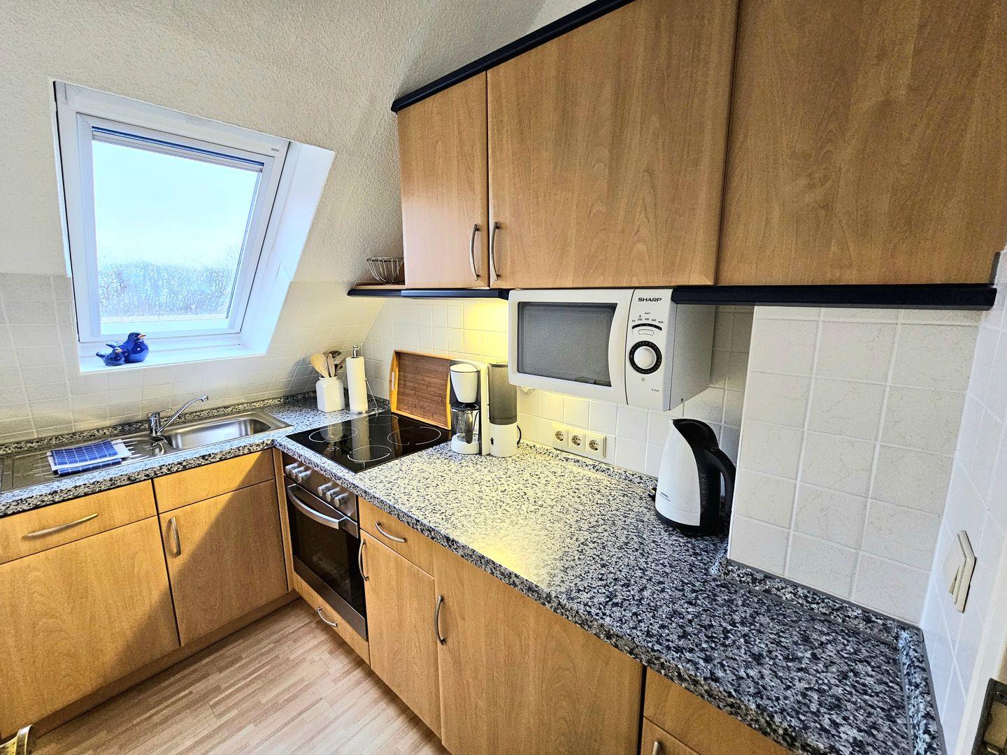 Helle Ferienwohnung Kuukuuksbloem auf Norderney, zentral gelegen, nahe Strand und Restaurants, mit WLAN und moderner Küche.