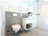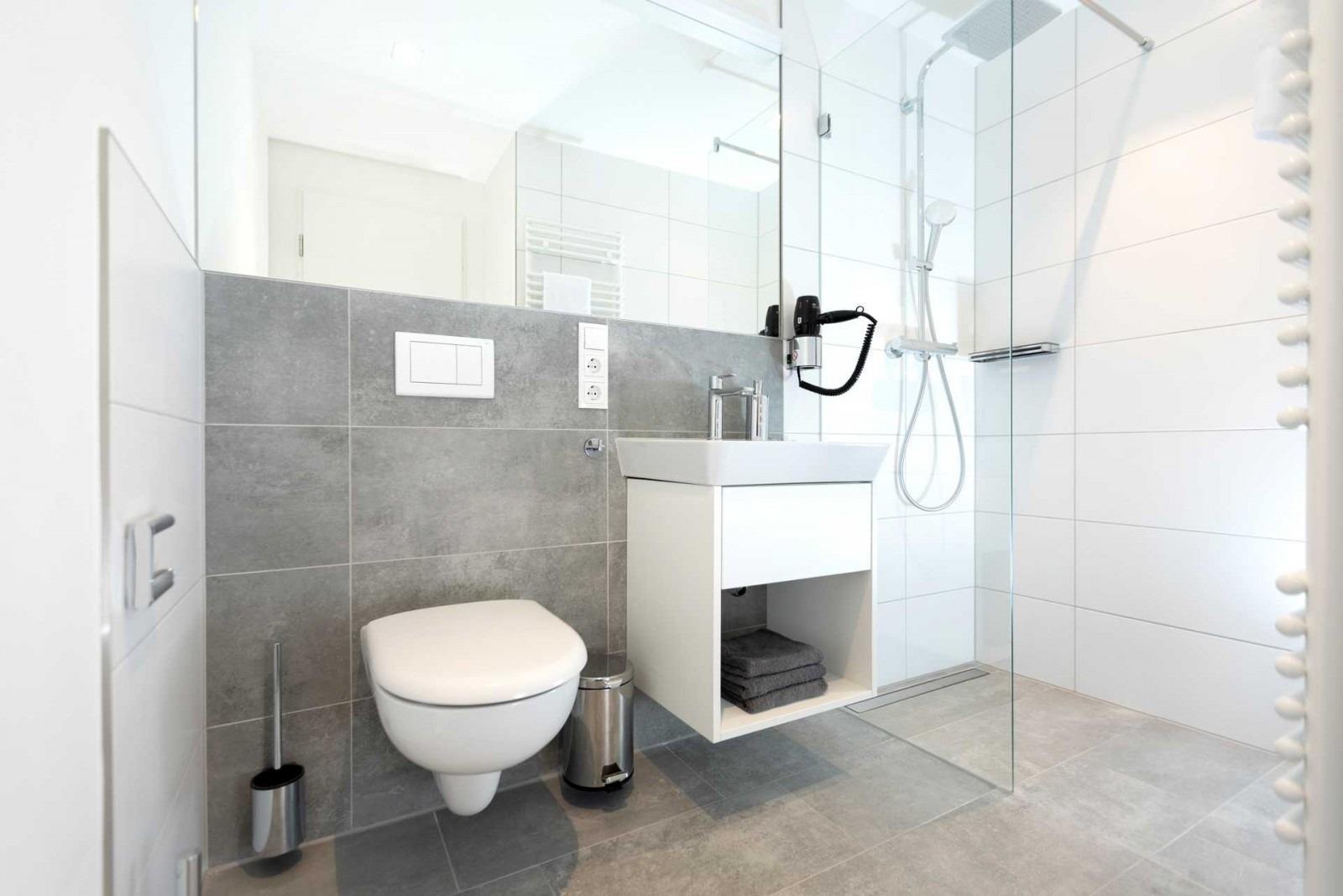 Dieses funktionale, elegante Design wird im Badezimmer durch eine bodengleiche Dusche fortgesetzt. Waschtischunterschrank, Spiegel, Föhn und Seifenspender gehören ebenfalls zur Standardeinrichtung.